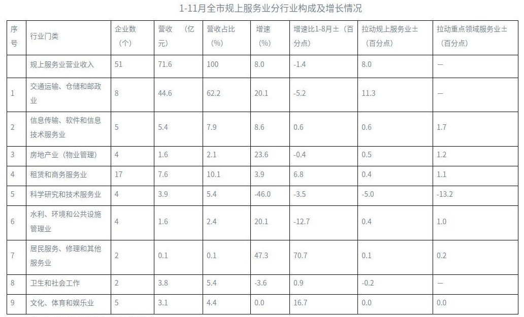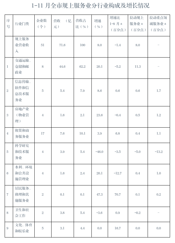 1-11月,全市51户规上服务业企业实现营业收入71.6亿元,同比增长8.0%。纳入核算行业继续保持下降。1-11月,全市纳入GDP核算的规上服务业企业(41户)实现营业收入23.2亿元,同比下降7.9%。