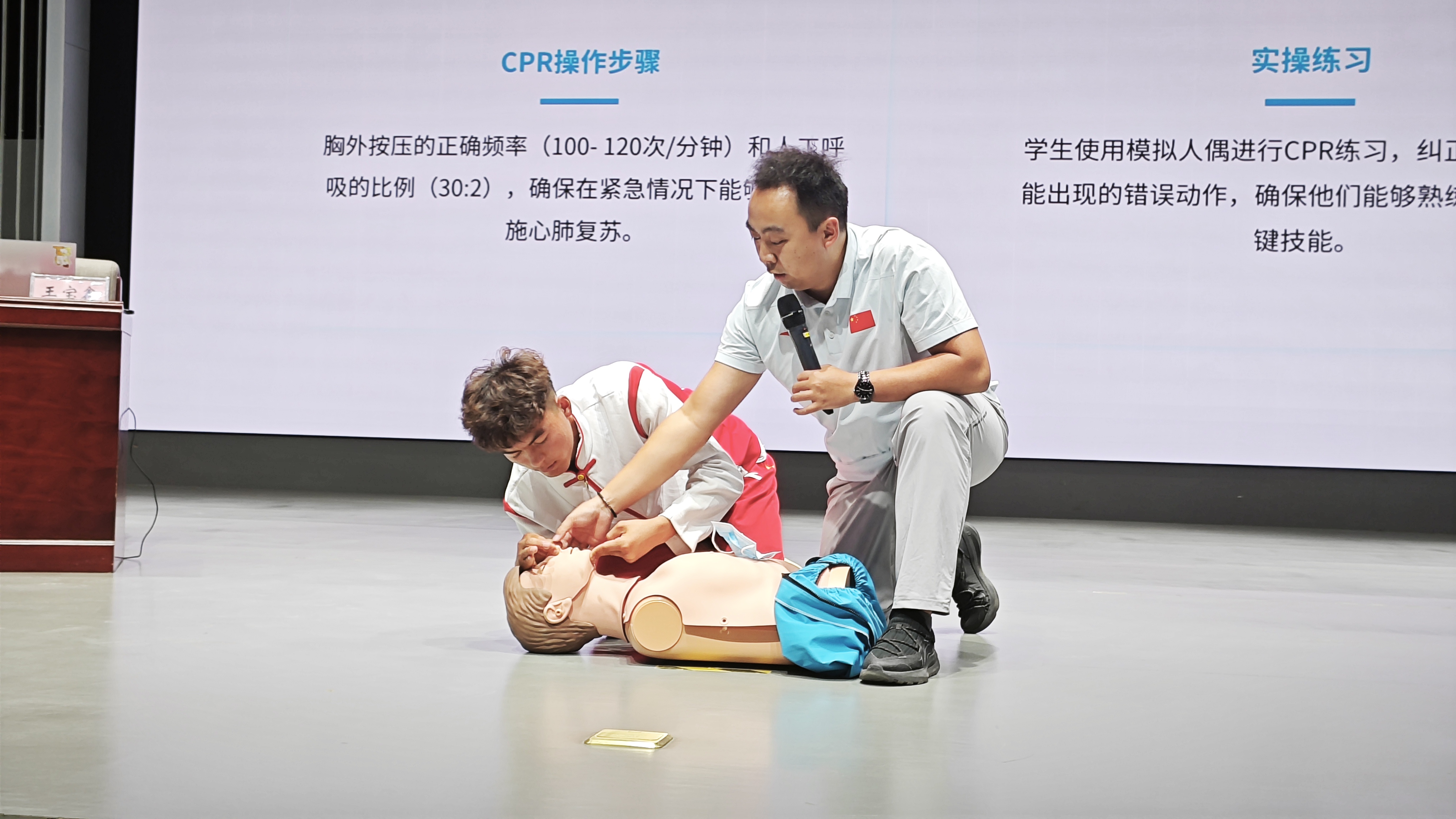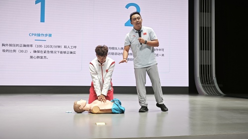 活动现场,国家职业资格鉴定游泳救生员考评员王宝鑫老师结合真实案例,为师生详细讲解溺水事故带来的严重危害、如何预防溺水、遇到他人溺水时该如何正确施救、溺水后的自救方法以及防溺水“四不三会”等重要内容。同时,利用“假人”教具,为同学们详细讲解并演示了对溺水者实施心肺复苏的流程及实操要点。以“理论+实践”的方式帮助同学们更好地理解防溺水知识,让他们在体验中掌握应急技能以及施救方法。