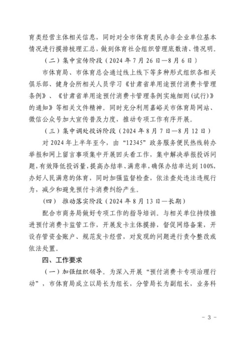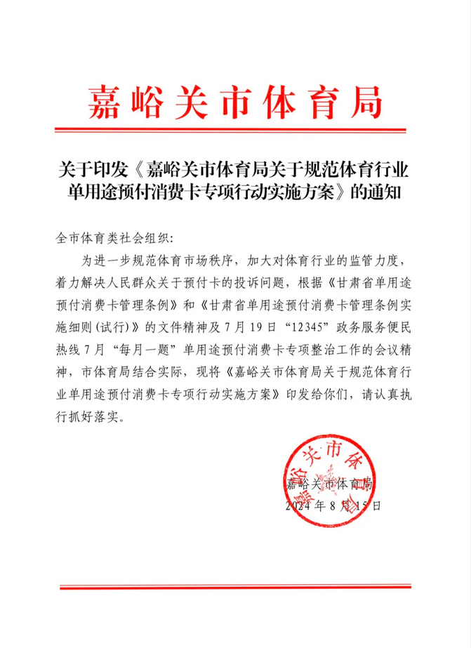 关于印发《嘉峪关市体育局关于规范体育行业单用途预付消费卡专项行动实施方案》的通知