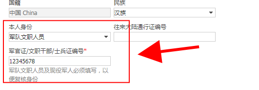 (二)现役军人和部队文职人员报名时,须使用有效的居民身份证进行申报,在网报系统本人身份一栏中选择相应的“军人”身份,并填写相关的军官证、警官证、文职干部证、士兵(官)证和军队学员证等证件号码。