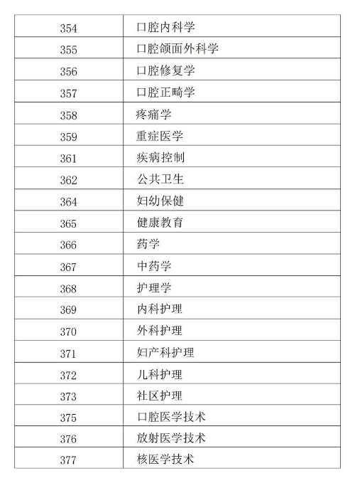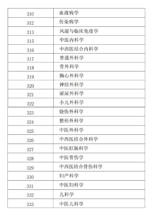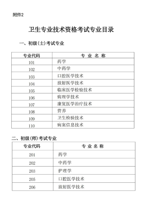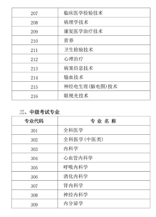 (六)自2024年起,职业病学并入内科学专业、结核病学并入传染病学专业、职业卫生并入公共卫生专业、计划生育按专业内容分别并入妇产科和泌尿外科专业;中医护理并入护理学专业,所有护理学专业考试中相应增加中医内容。目录中取消中医护理学(初级师、中级,原专业代码分别为204、374)、结核病学、职业病学、计划生育、职业卫生(中级,原专业代码分别为311、314、360、363)专业类别。