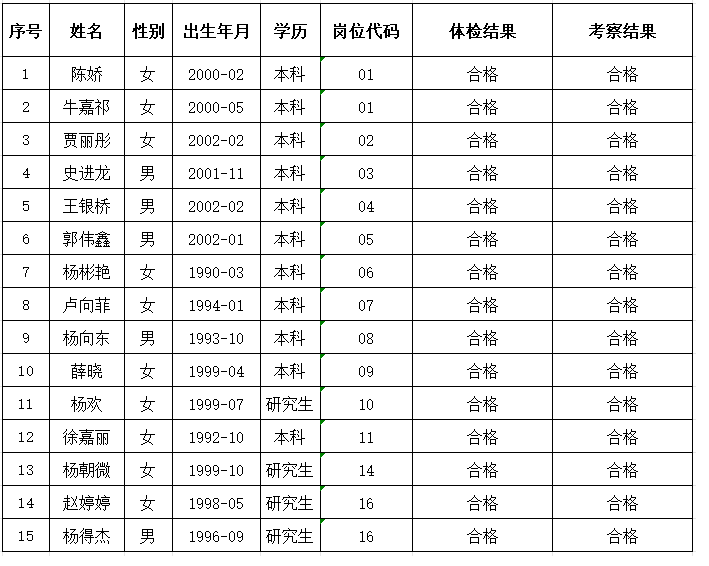 嘉峪关市卫生健康系统2025年春季公开招聘和引进医疗卫生高层次及急需紧缺专业技术人员面试、体检及考察工作已结束。现公布体检、考察结果,并将拟聘用人员名单公示如下,请社会各界监督。