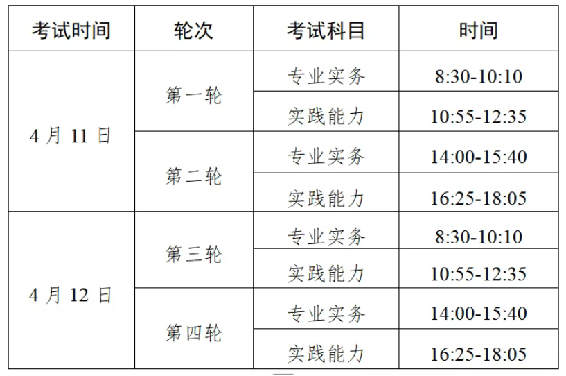 考试采用人机对话形式,试题均为客观题,题量为120问。考试分为4轮次进行,每半天为一个轮次,考生将随机分配至其中一个轮次参加专业实务和实践能力两个科目的考试具体考试时间以准考证为准。