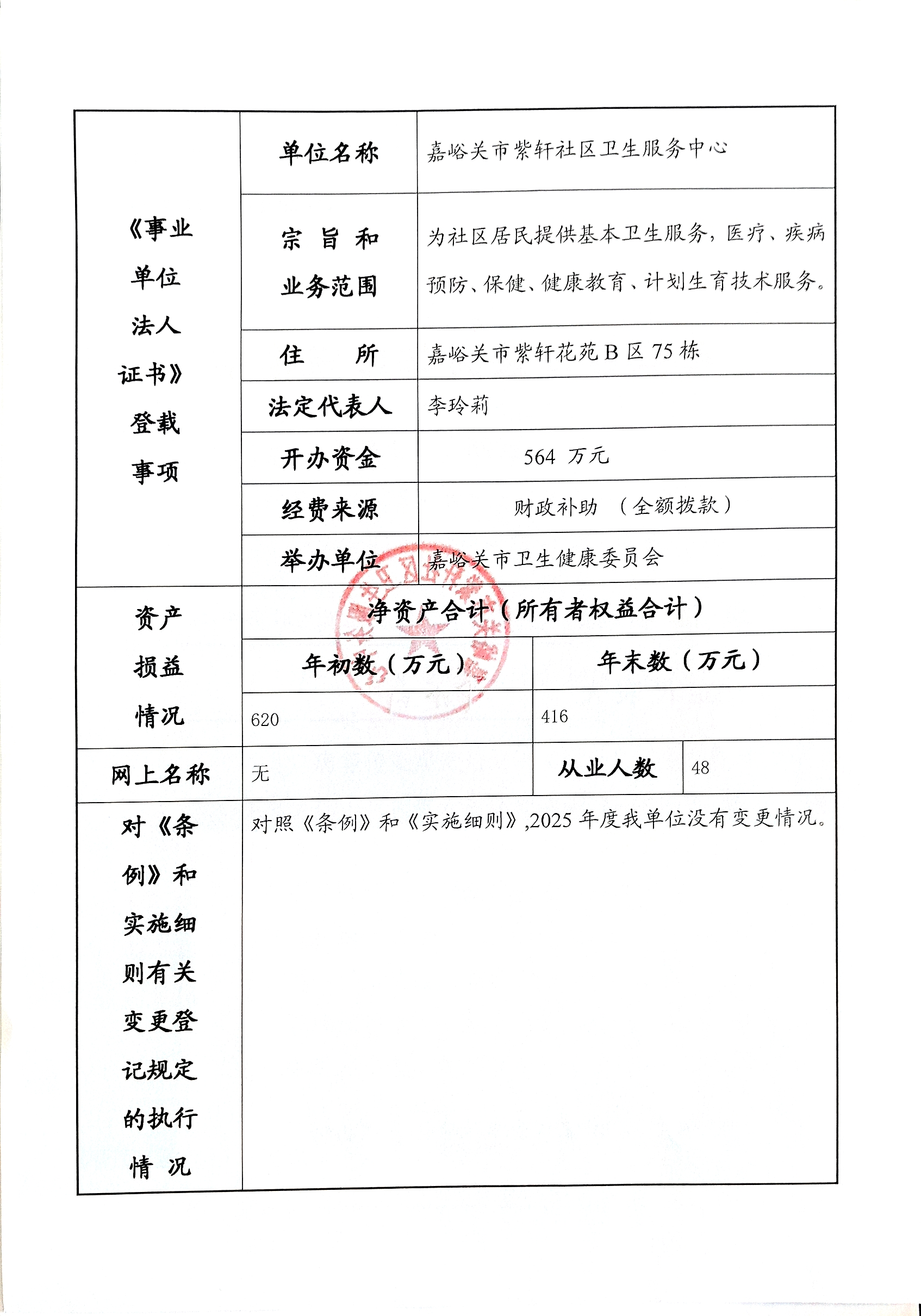 嘉峪关市紫轩社区卫生服务中心事业单位法人(2025)年度报告书