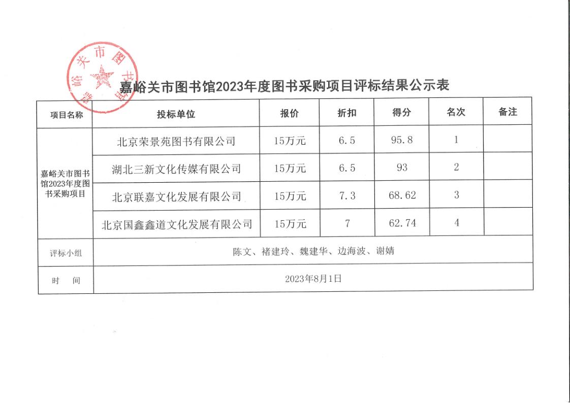 嘉峪关市图书馆2023年度图书采购项目评标结果公示表