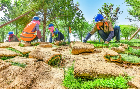 近日,我市机场路绿化景观带草坪移栽工作已近尾声,标志着机场路绿化提升项目进入冲刺阶段。