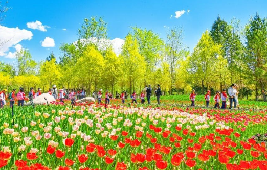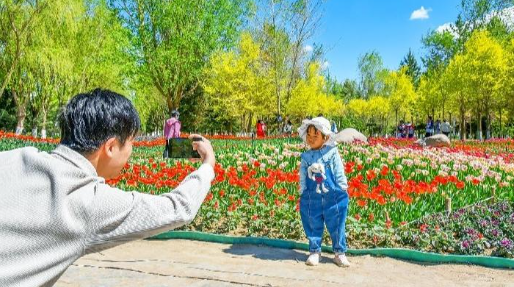 与此同时,郁金香园也成为游客赏花看景的热门打卡点。不少游客特意穿上漂亮的衣服,精心打扮后来到这里,在花海中拍照留念,定格美好瞬间。一些摄影爱好者更是早早架好设备,寻找最佳拍摄角度,想要捕捉郁金香最动人的模样。
