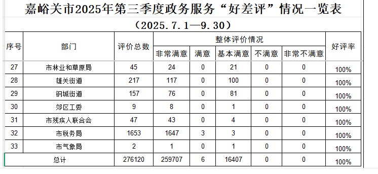 嘉峪关市2025年第三季度政务服务“好差评”评价结果公示