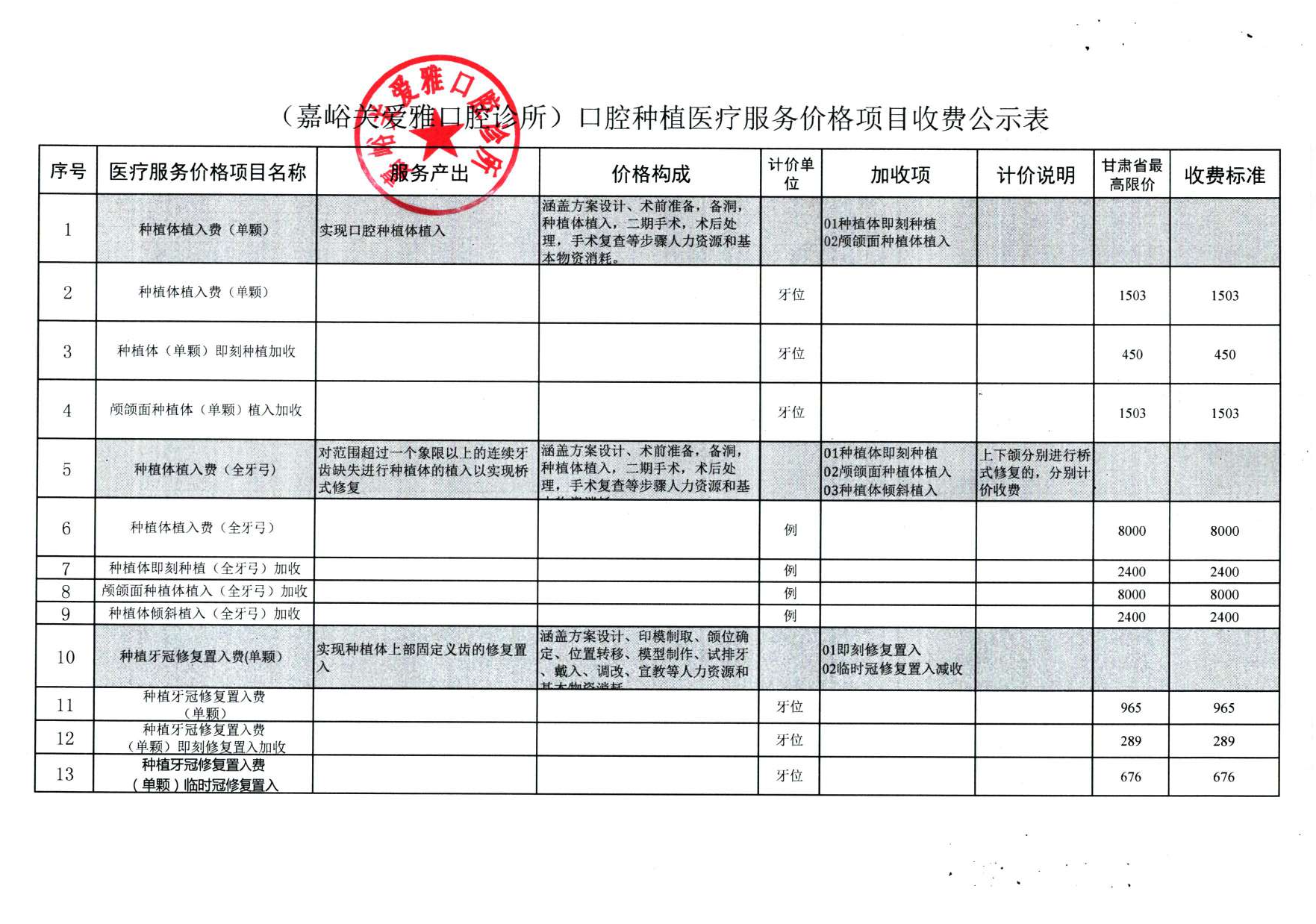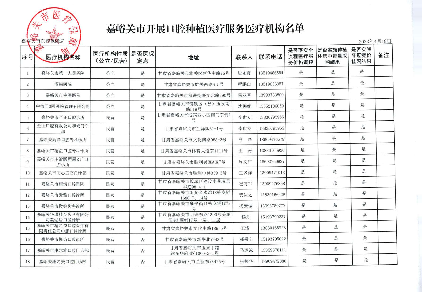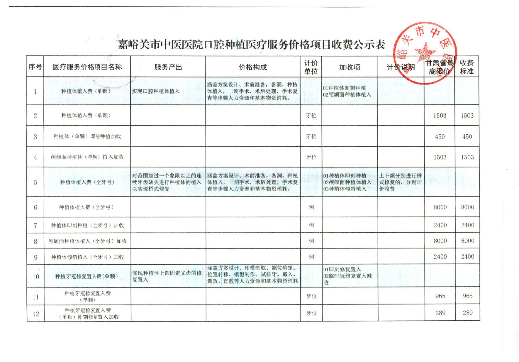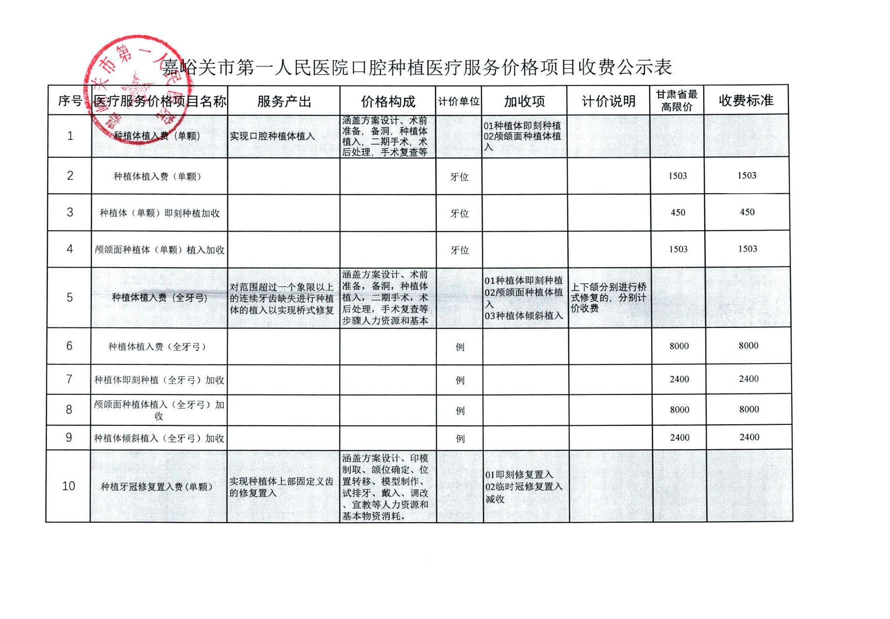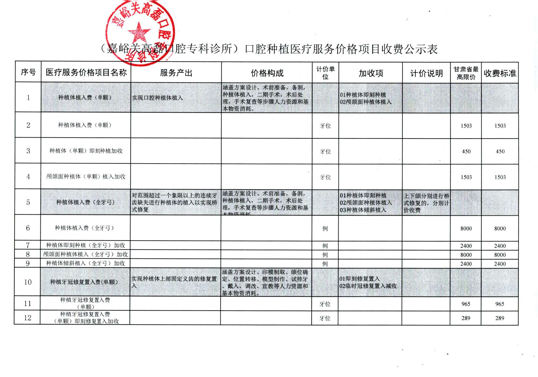嘉峪关市开展口腔种植医疗服务机构名单及各医疗机构现行医疗服务价格项目公示