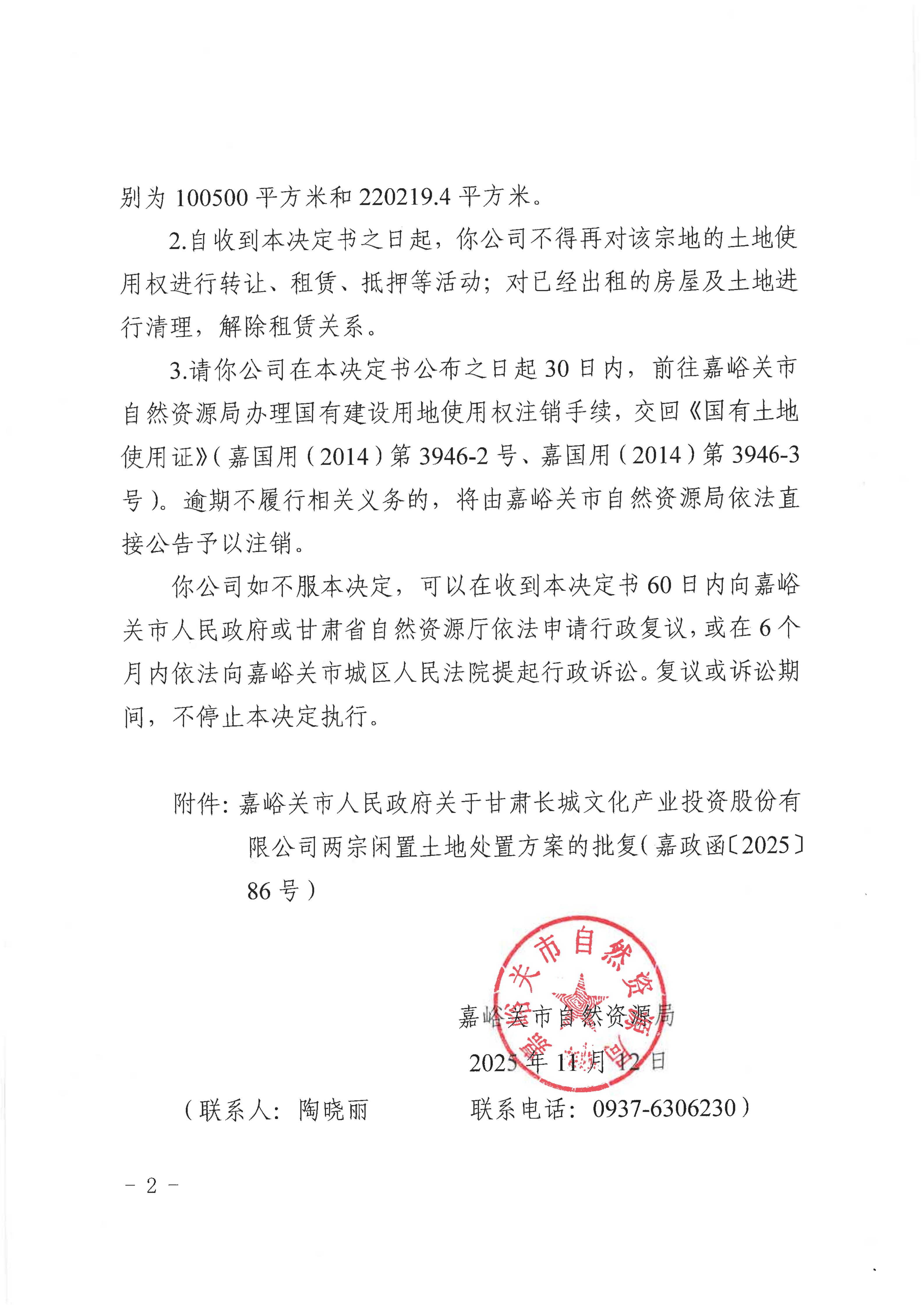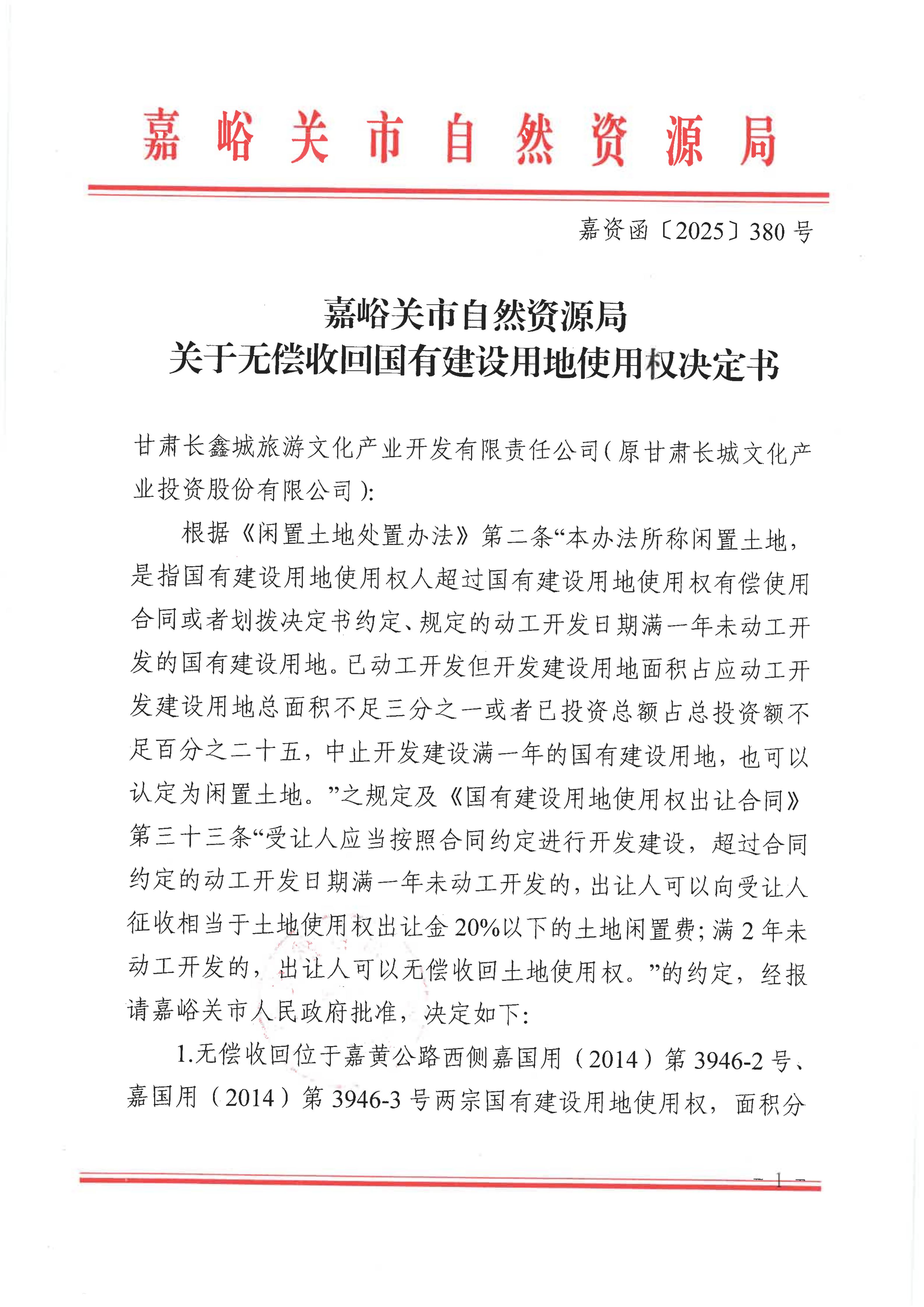 嘉峪关市自然资源局关于无偿收回国有建设用地使用权决定书