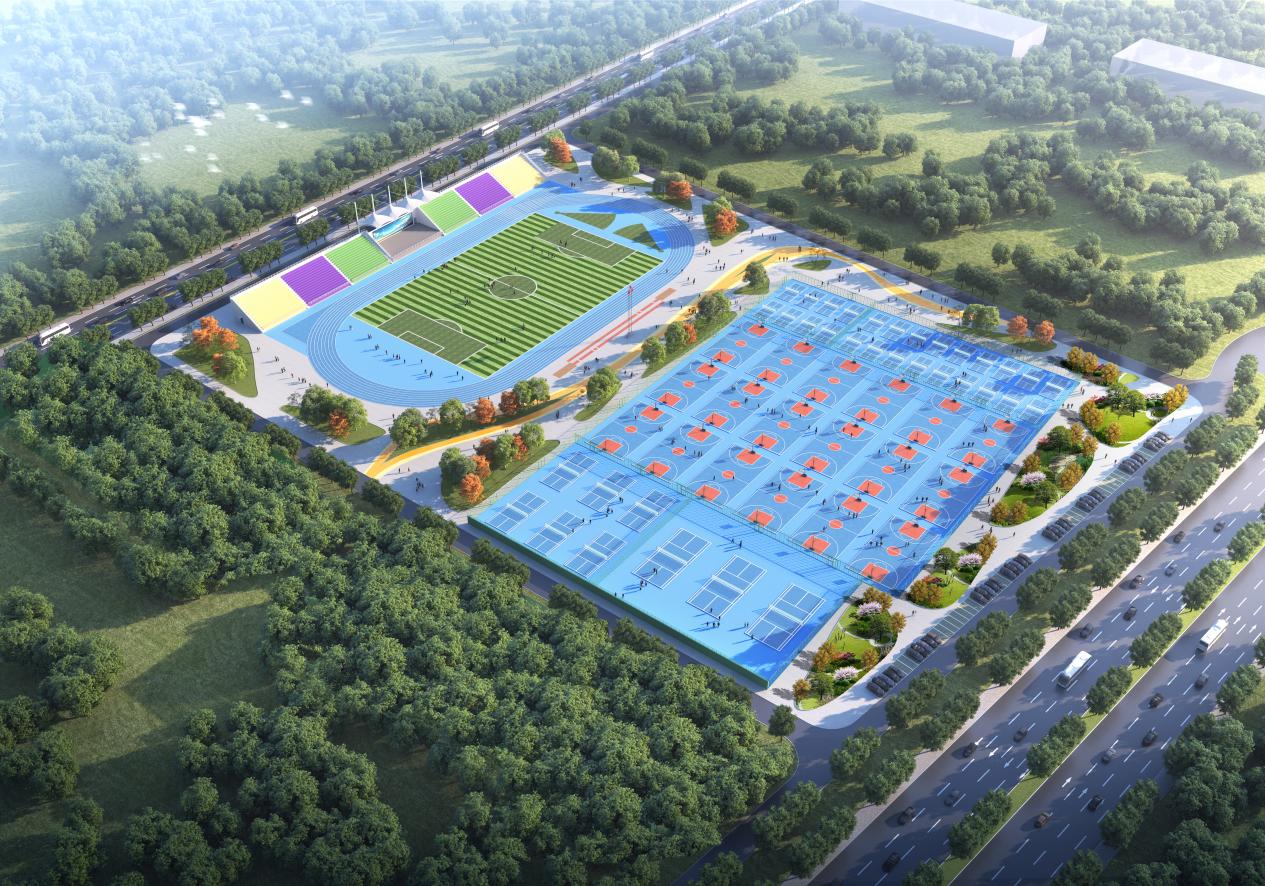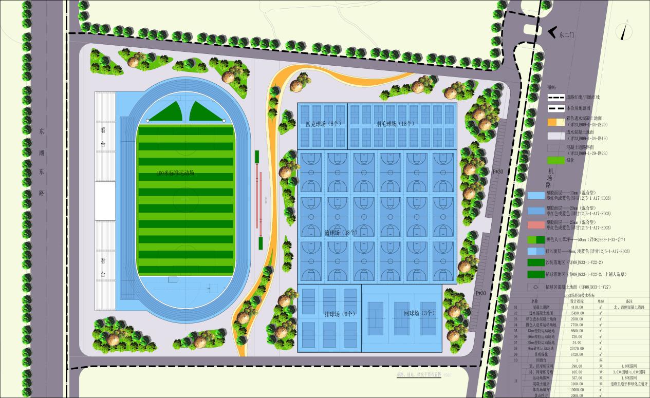 7、方案建设内容:新建看台、主席台及张拉膜结构罩棚,建筑高度7.65米;新建400m环形跑道,总面积7354㎡;建设人造草运动场,面积7750㎡;建设跳远沙坑、铅球投掷功能区,总面积380㎡;配套建设球类运动场地,含共8个匹克球场地、18个羽毛球场地、18个篮球场、6个排球场、3个网球场,总面积20170㎡。