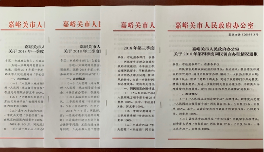 2.做好网民留言办理工作。按照《关于进一步加强网民留言办理工作的通知》(嘉办字〔2017〕150号),进一步规范办理流程。2018年,共受理市长信箱有效留言141条,答复141条;受理“人民网地方领导留言板”留言67条,答复67条;办理“中国甘肃政民互动平台”网民留言4条。编报《网民留言周报》共35期,并呈领导阅示,按季度向全市通报各部门网民留言办理情况。