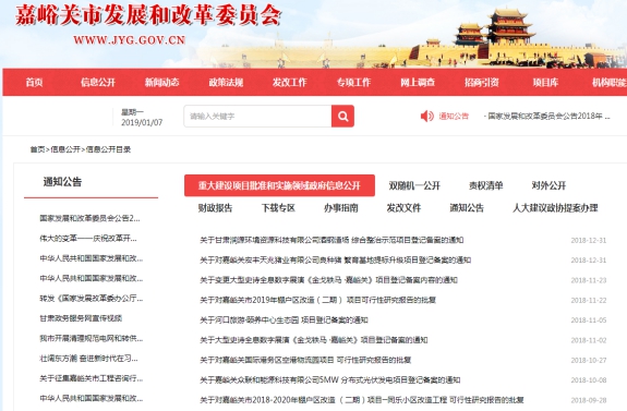 3.重大建设项目信息公开。印发了《嘉峪关市重大建设项目批准和实施领域政府信息公开工作实施方案》(嘉政办发〔2018〕32号)、《关于做好重大建设项目批准和实施领域政府信息公开工作的通知》(嘉电政函(2018)5号),要求市发改委、工信委、环保局、国土局、水务局、规划局、建设局、审计局等部门按照各自职责分工,及时公开重大建设项目批准和实施领域批准服务信息、批准结果信息、招标投标信息、征收土地信息、重大设计变更信息、施工有关信息、质量安全监督信息、竣工等有关信息,并依法监督项目法人单位公开项目信息,回应社会关切。各相关部门按照要求统一在部门网站开设了“重大建设项目批准和实施领域政府信息公开”专栏,确定专人负责栏目更新,由市电子政务办公室会同市发改委每月检查栏目更新情况并向全市通报,督促部门及时公开信息。