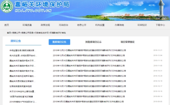 5.环保信息公开。市环保局开设嘉峪关市空气质量实时发布系统、全国城市空气质量实时发布平台和全国空气质量预报信息发布系统栏目,细化公开空气质量预报、城市空气质量指数范围、空气质量级别及首要污染物、对人体健康的影响和建议措施等内容,方便公众实时查询空气质量相关信息。定期公布环境空气质量月报、水质例行监测月报和每月集中式生活饮用水源地水质状况报告、每季度地下水水质状况报告、功能区噪声监测结果、沙尘天气快报、2018年度环境质量状况公报及嘉峪关市2018年固体废物污染环境防治信息公告等内容,及时向公众反馈我市环境质量状况相关权威信息。在网站首页设立了“环评审批”专栏,及时公开审批项目相关工作信息。在环境执法检查过程中,加大执法依据、内容、标准、程序和结果的公开力度。