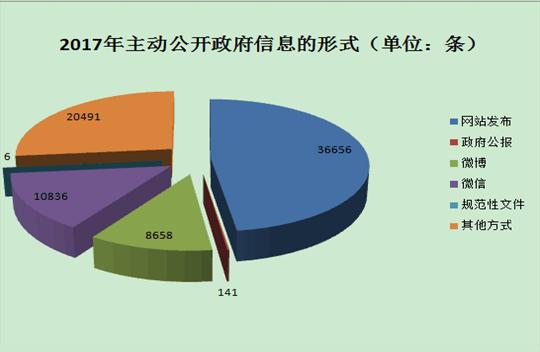 (三)主动公开政府信息的形式。2017年,我市主动公开信息总数76788条。其中,公开规范性文件6件;刊发政府公报3期共141条;通过政府网站公开信息数36656 条;通过政务微博公开信息数8658条;通过政务微信公开信息数10836条;通过广播、电视、报刊等其他方式公开信息数20491条。