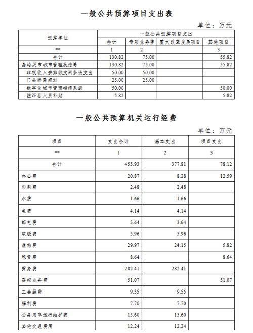 嘉峪关市城市管理执法局2020年度一般公共预算机关运行经费安排支出预算数455.93万元。比上年减少100.25万元,下降17.71%。