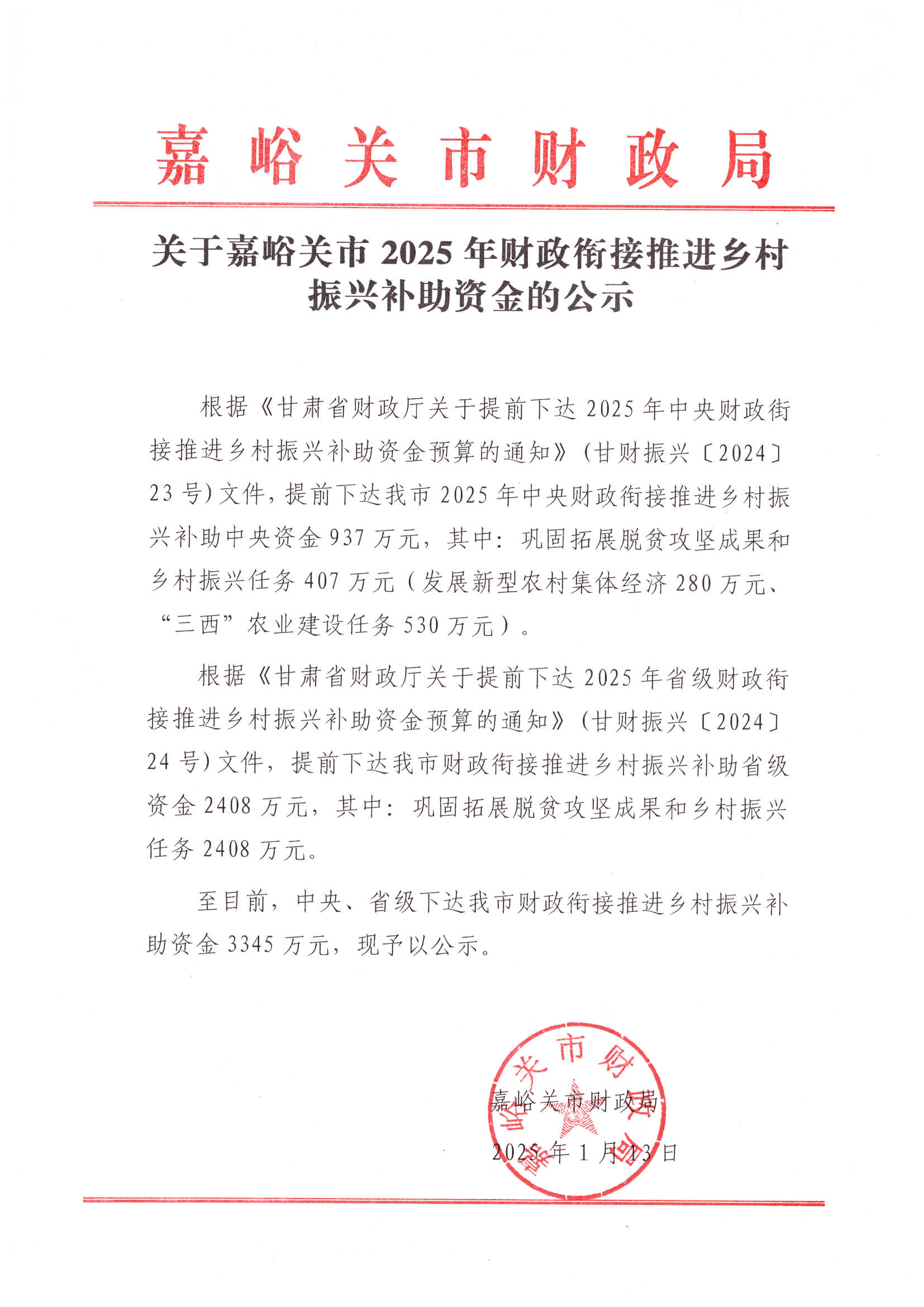关于嘉峪关市2025年财政衔接推进乡村振兴补助资金的公示