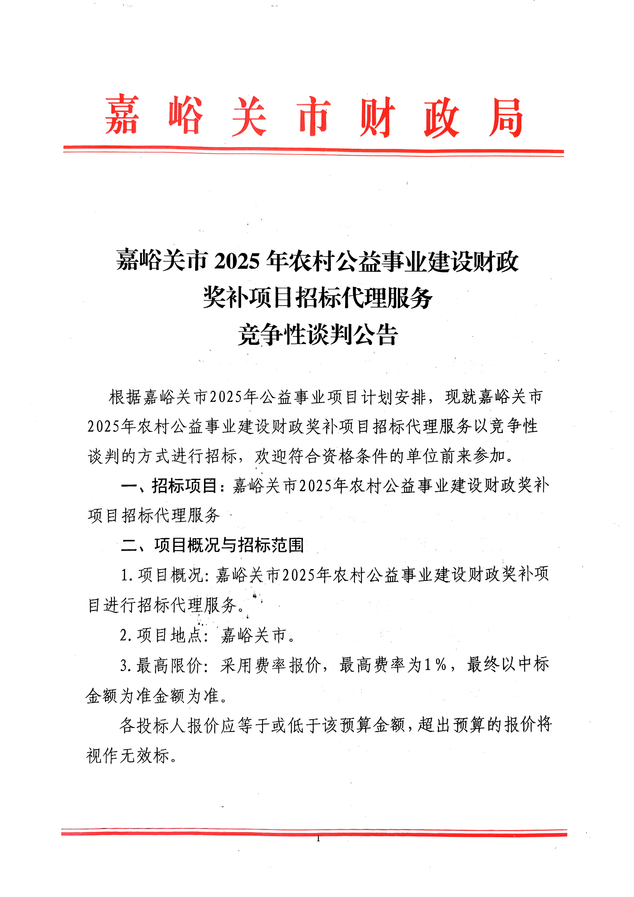 嘉峪关市2025年农村公益事业建设财政奖补项目招标代理服务竞争性谈判公告