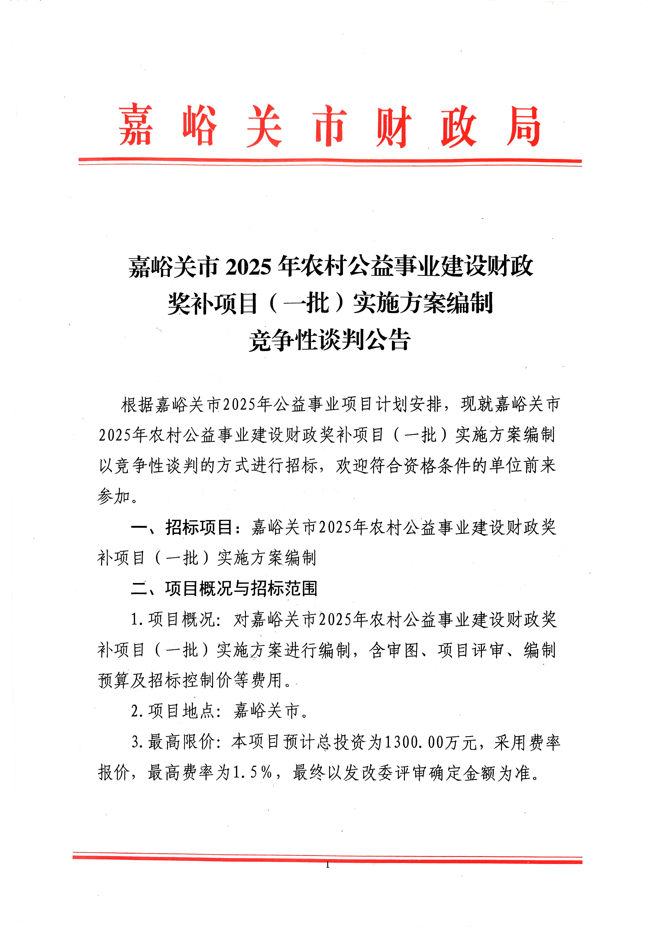嘉峪关市2025年农村公益事业建设财政奖补项目(一批)实施方案编制竞争性谈判公告