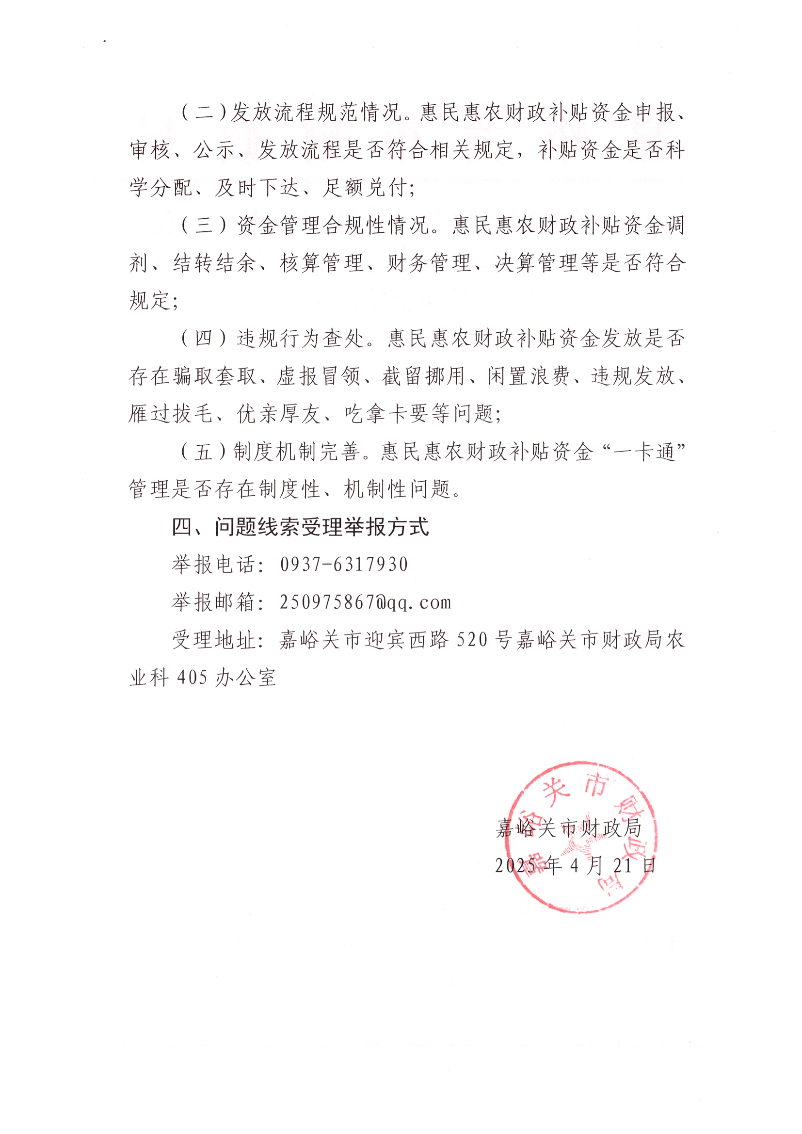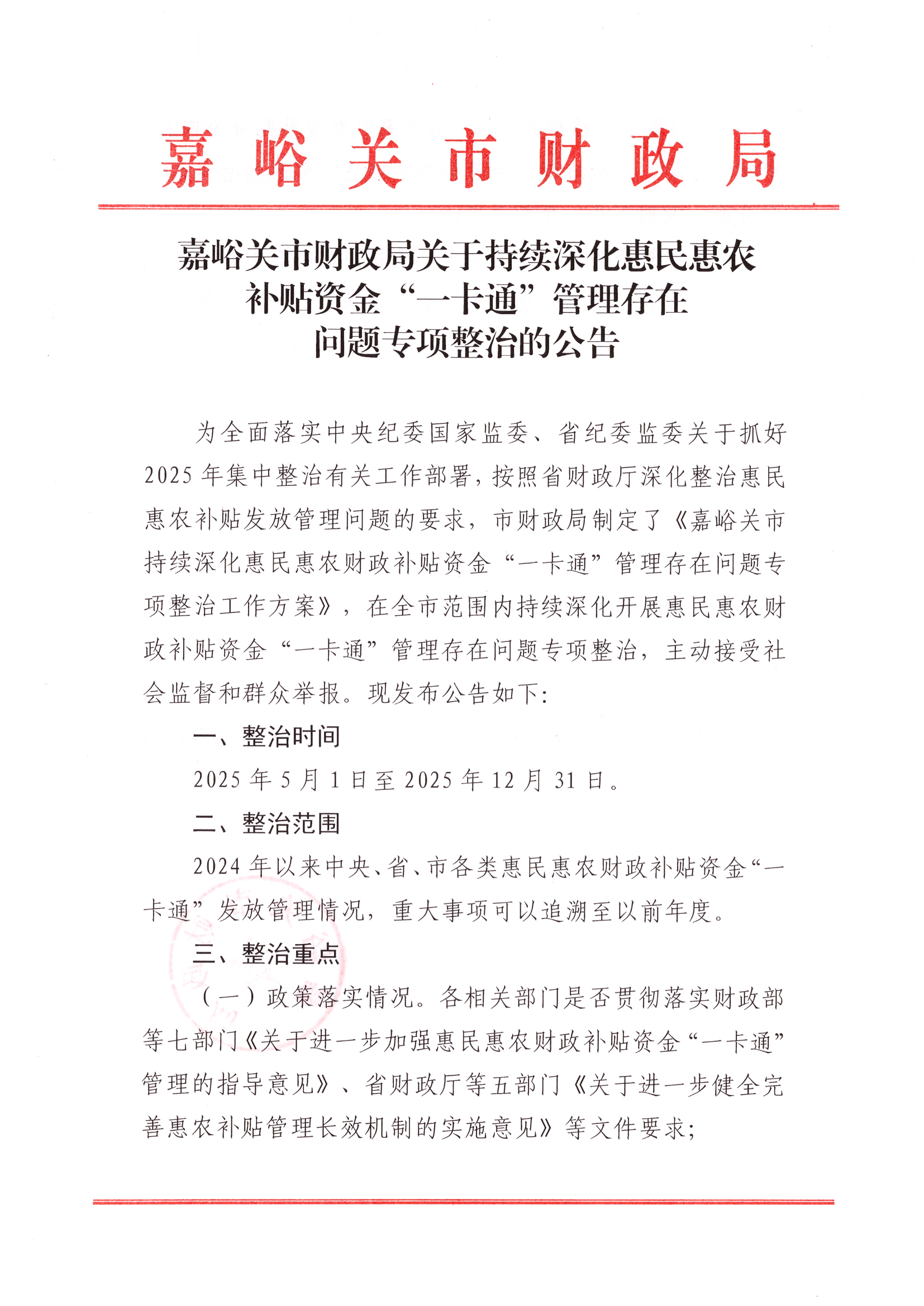 嘉峪关市财政局关于持续深化惠民惠农补贴资金“一卡通"管理存在问题专项整治的公告