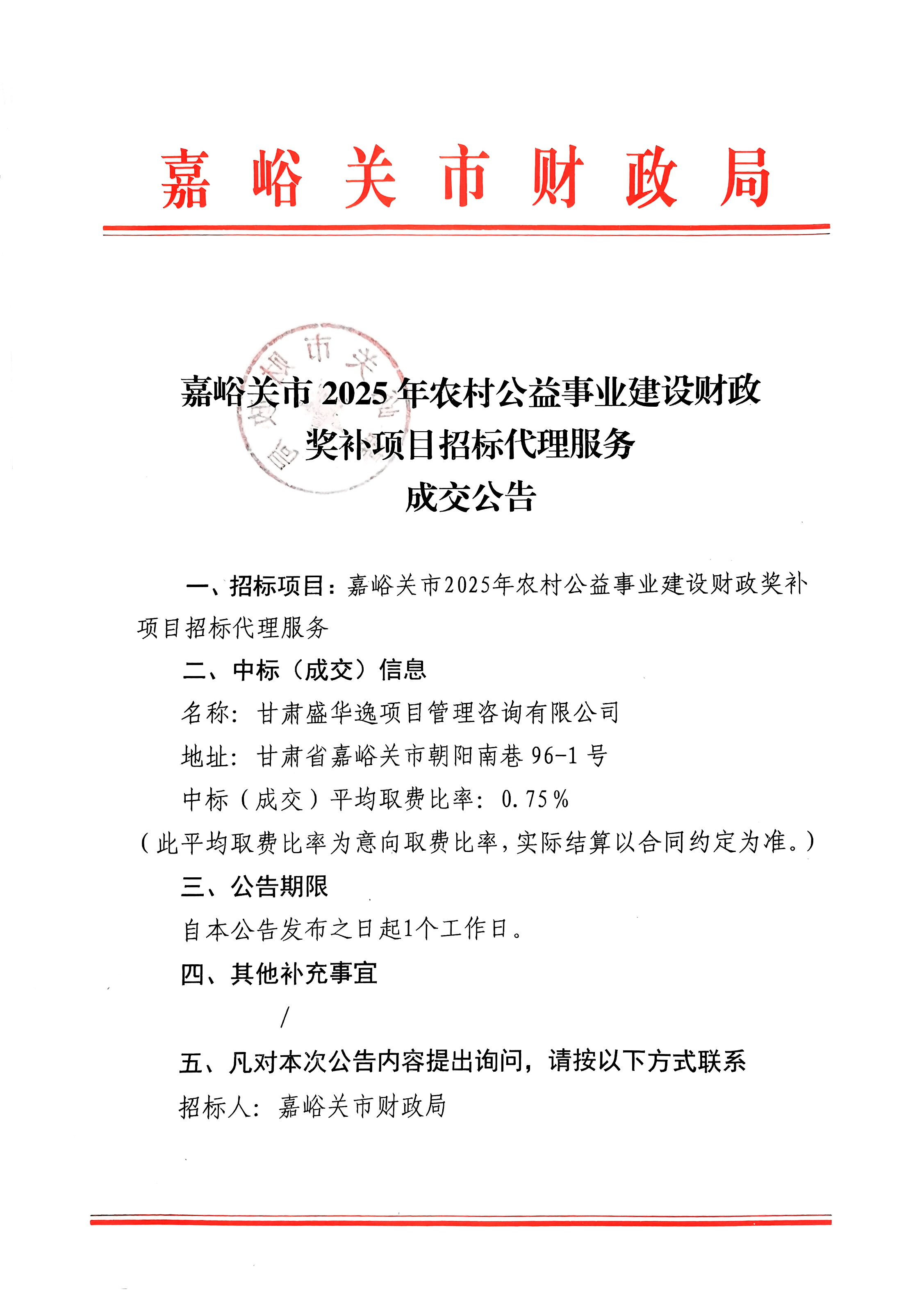 嘉峪关市2025年农村公益事业建设财政奖补项目招标代理服务成交公告