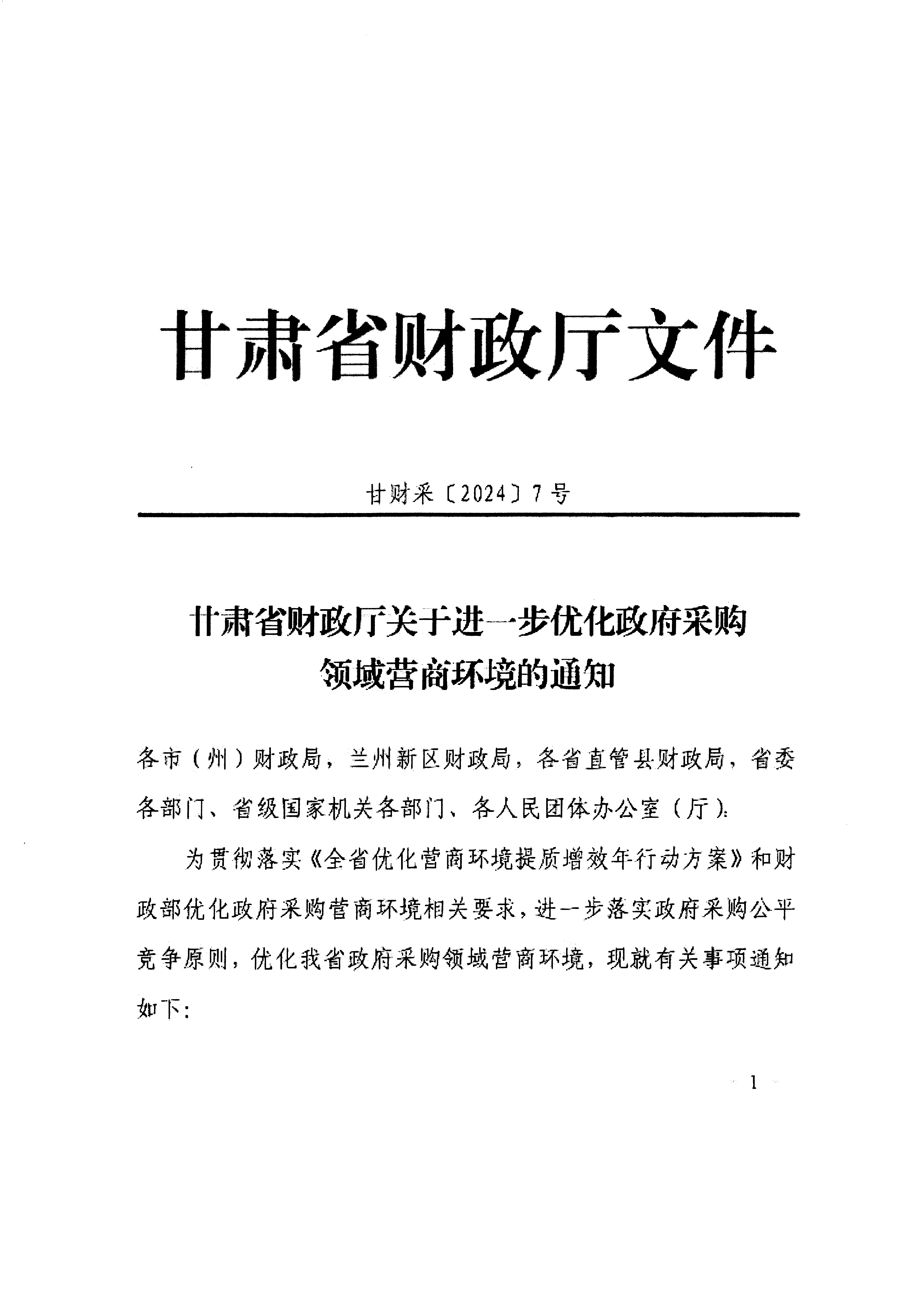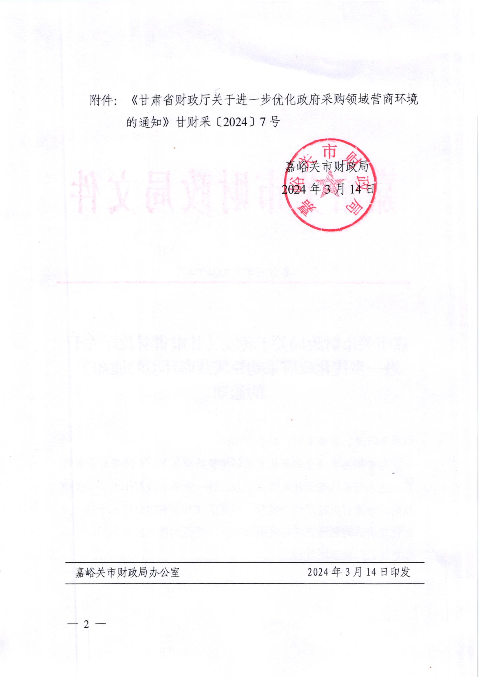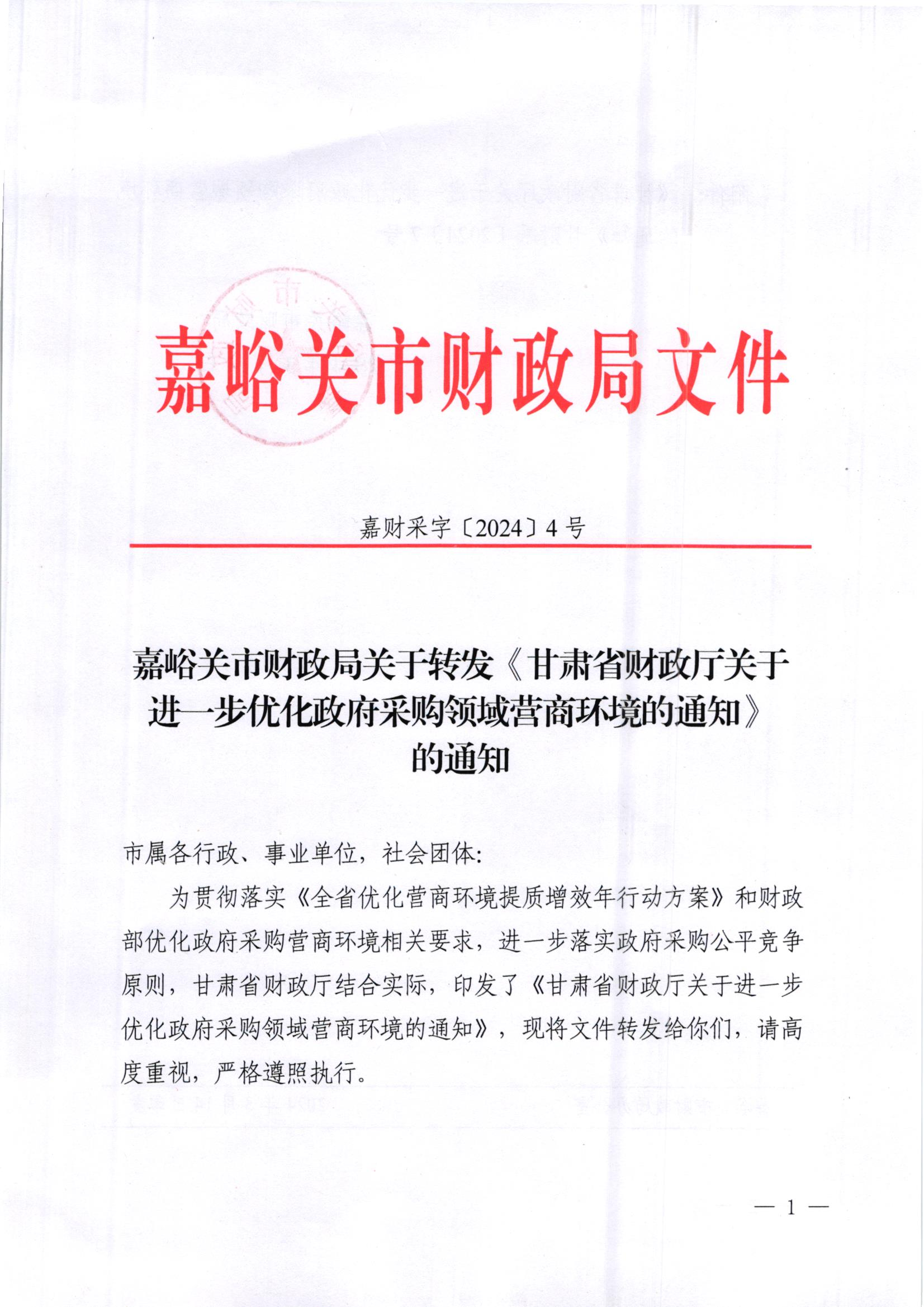 嘉峪关市财政局关于转发《甘肃省财政厅关于进一步优化政府采购领域营商环境的通知》的通知