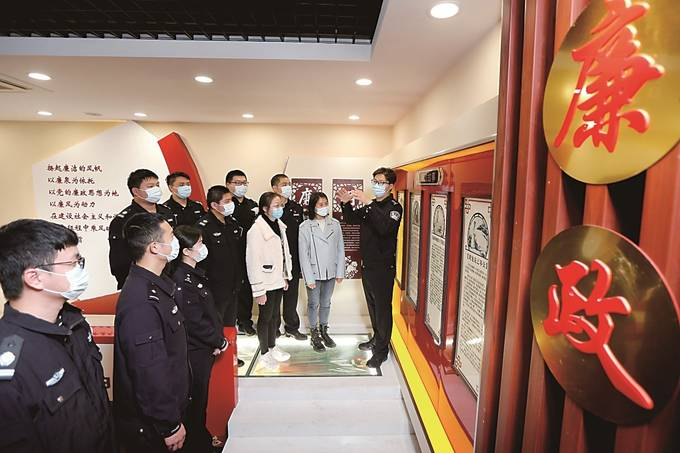2021年11月16日,南京港出入境边防检查站部分民警、辅警等来到执勤二队廉政警示教育展厅接受廉政教育。央视网发 万程鹏 摄