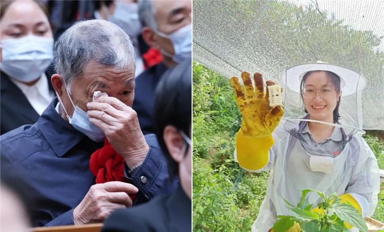 2021年2月25日,在全国脱贫攻坚总结表彰大会上,“全国脱贫攻坚楷模”黄文秀的父亲黄忠杰替女儿戴上了大红花,并洒下泪水。2019年6月17日,黄文秀牺牲在脱贫攻坚一线,献出了年仅30岁的宝贵生命。新华社发