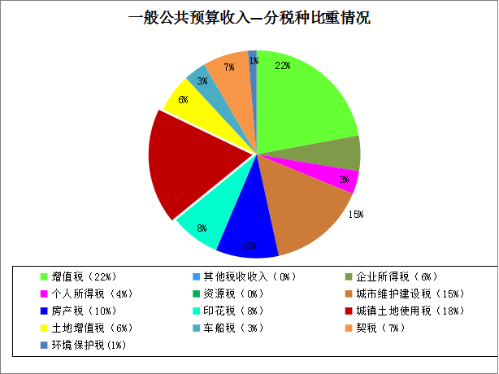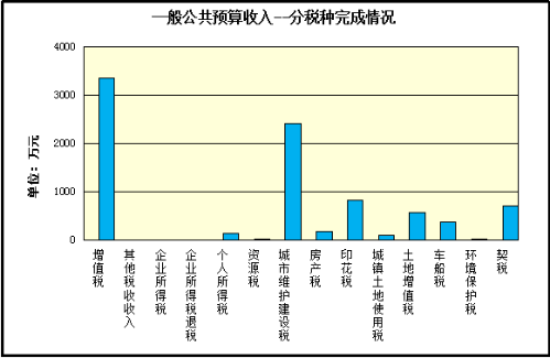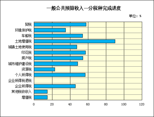 分税种情况,征收的12个税种中完成均衡进度的税种为6个,分别是个人所得税、房产税、印花税、土地增值税、车船使用和牌照税、契税,累计完成24963.5万元,占年预算12.54%;未完成均衡进度的税种为6个,分别是增值税、企业所得税、资源税、城市维护建设税、城镇土地使用税、环境保护税,累计完成41240.6万元,占年预算20.72%。同时呈现出“六升六降”的特点,占税收比重八成的四个主体税种中个人所得税收入增长明显,同比增长87.1%,增收1111.1万元,正向拉动整体税收增长1.1个百分点,增值税同比下降70.5%,同比减收34909万元,负向拉动整体税收下降35.3个百分点,城市维护建设税同比下降7.1%,同比减收780万元;企业所得税同比下降39.4%,减少2383.5万元,负向拉动整体税收下降2.4个百分点。八个小税种占税收的比重为二成,同比增长的小税种5个,分别是房产税、印花税、土地增值税、车船税、契税,同比增长分别为12.9%、25.6%、82.8%、13.9%、33.3%,合计增收5030.8万元,正向拉动整体税收增长5.1个百分点。同比下降的小税种3个,分别是资源税、城镇土地使用税、环境保护税,同比下降分别为34%、3.1%、32.5%,合计减少820.2万元,负向拉动整体税收下降0.83个百分点。
