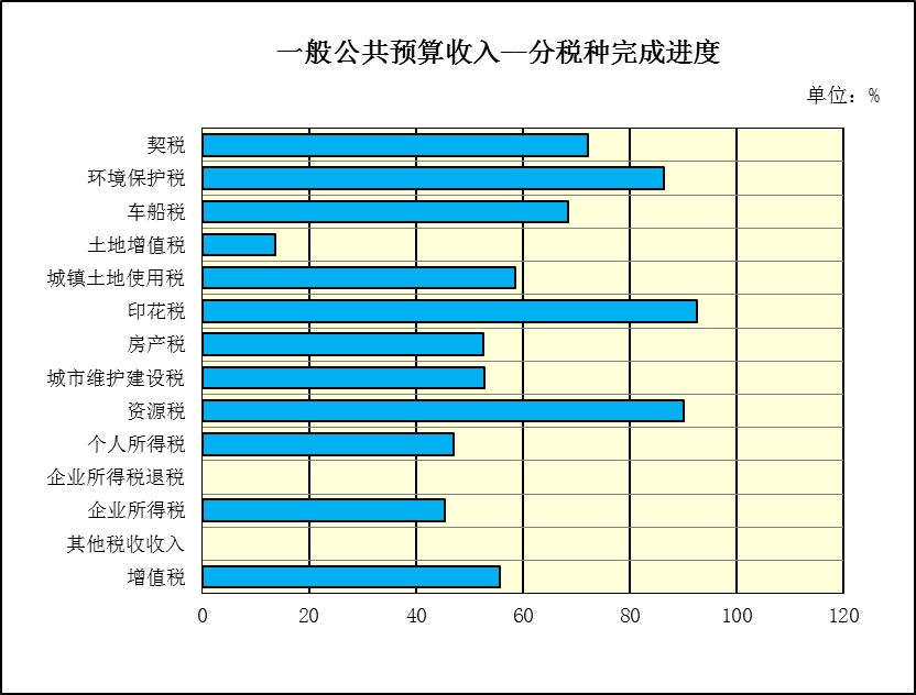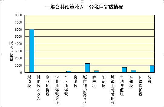 分税种看:征收的12个税种中完成均衡进度的税种5个,分别是资源税、印花税、车船税、环境保护税、契税累计完成19569万元,占年预算80.1%;未完成均衡进度的税种8个,分别是增值税、企业所得税、个人所得税、房产税、城市维护建设税、土地增值税、城镇土地使用税累计完成74462万元,占年预算53.3%。同时呈现出“五升七降”的特点,其中增值税、城镇土地使用税、车船税、环境保护税拉动作用明显。