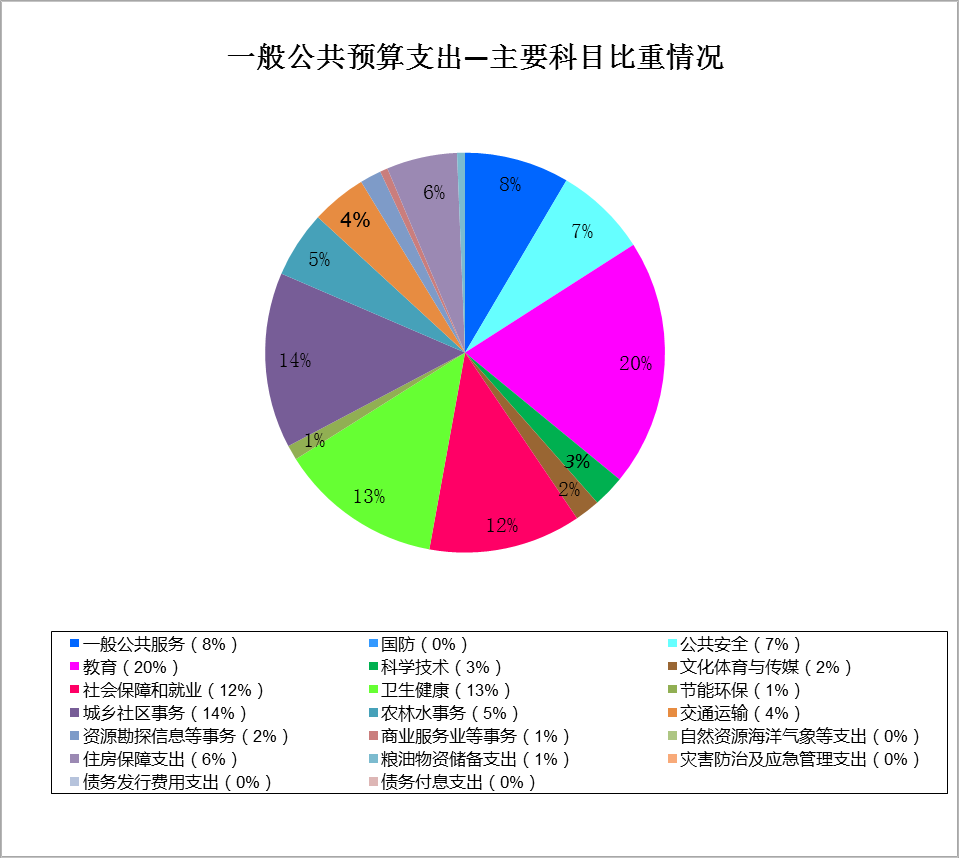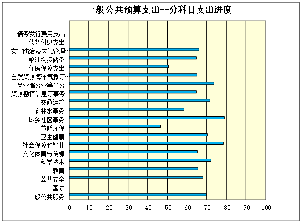 分科目情况:一般公共服务支出完成18368万元,占变动预算的70%,同比下降16%;公共安全支出完成15876万元,占变动预算的68.2%,同比下降3.4%;教育支出完成43936万元,占变动预算的65.6%,同比增长1.5%;科学技术支出完成5590万元,占变动预算的72.2%,同比增长82.6%;文化体育与传媒支出完成5970元,占变动预算的65.4%,同比下降73%;社会保障和就业支出完成28896万元,占变动预算的78.6%,同比增长98.6%;卫生健康支出完成27920万元,占变动预算的70.5%,同比增长29.8%;节能环保支出完成4022万元,占变动预算的46.6%,同比下降55%;城乡社区事务支出完成29601万元,占变动预算的79.1%,同比下降16.8%;农林水事务支出完成12833万元,占变动预算的58.6%,同比增长16.8%;交通运输支出完成9129万元,占变动预算的71.7%,同比增长60%;资源勘探信息等事务支出完成4745万元,占变动预算64.8%,同比增长137.7%;商业服务业等事务支出完成1885万元,占变动预算的73.6%,同比增长36.4%;自然资源海洋气象等支出完成6461万元,占变动预算65.1%,同比增长342.5%;住房保障支出完成12974万元,占变动预算50.5%,同比增长42.2%;粮油物资储备支出完成1620万元,占变动预算的64.8%,同比下降3.2%;灾害防治及应急管理支出完成1791万元,占变动预算的66.1%,同比增长6.2%。其他支出完成220万元,占变动预算的28.5%,同比增长168.3%。债务付息支出完成9089万元,占变动预算的67.8%,同比下降62.1%。