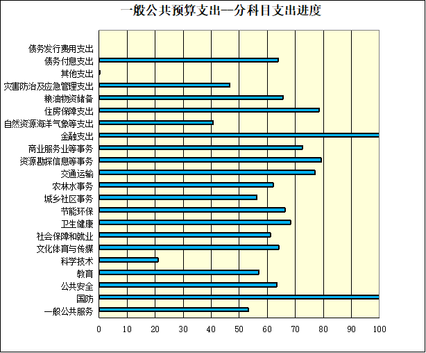 分科目情况:一般公共服务支出完成16817万元,占年预算的53.2%,同比增长2.9%;公共安全支出完成12758万元,占年预算的63.5%,同比下降11.4%;教育支出完成33625万元,占年预算的57%,同比增长16.4%;科学技术支出完成1874万元,占年预算的21%,同比下降60.7%;文化体育与传媒支出完成15507万元,占年预算的64%,同比增长235.8%;社会保障和就业支出完成25461万元,占年预算的61.2%,同比下降2.6%;卫生健康支出完成26327万元,占年预算的68.3%,同比下降0.3%;节能环保支出完成4041万元,占年预算的66.2%,同比增长6.2%;城乡社区事务支出完成28791万元,占年预算的56.3%,同比增长3.1%;农林水事务支出完成14434万元,占年预算的62.1%,同比增长22.6%;交通运输支出完成4386万元,占年预算的77.1%,同比下降51.2%;资源勘探信息等事务支出完成12849万元,占年预算79.3%,同比增长288.9%;金融支出完成4700万元,占年预算100%,同比增长100%;商业服务业等事务支出完成28306万元,占年预算的75.5%,同比增长2179.1%;自然资源海洋气象等支出完成1143万元,占年预算40.7%,同比下降59.8%;住房保障支出完成17458万元,占年预算78.5%,同比增长48.2%;粮油物资储备支出完成1685万元,占年预算的65.%,同比增长5%。灾害防治及应急管理支出完成3620万元,占年预算的46.7%,同比增长111.6%。