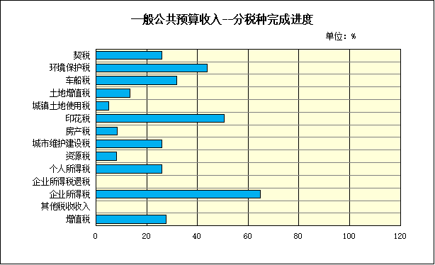 分级次情况:上划中央收入完成52856万元,占年预算的27.7%,同比下降0.4%;上划省级收入完成14609万元,占年预算的25.5%,同比下降43.5%。地区性财政收入完成159900万元,占年预算的27.8%,同比下降2.7%。