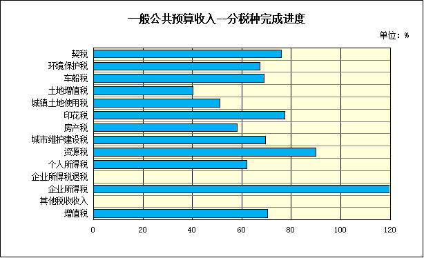 分级次情况:上划中央收入完成129605万元,占年预算的68%,同比增长18.9%;上划省级收入完成38505万元,占年预算的65.3%,同比下降3.1%。地区性财政收入完成385105万元,占年预算的67.1%,同比增长21.7%。