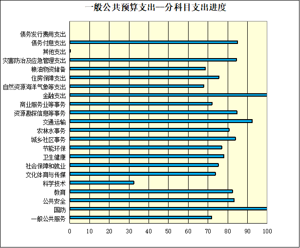 分科目情况:一般公共服务支出完成22703万元,占年预算的71.9%,同比增长3%;公共安全支出完成16740万元,占年预算的83.3%,同比下降3.4%;教育支出完成48539万元,占年预算的82.3%,同比下降2.9%;科学技术支出完成2888万元,占年预算的32.2%,同比下降48.8%;文化体育与传媒支出完成17876万元,占年预算的73.8%,同比增长162.8%;社会保障和就业支出完成31331万元,占年预算的75.3%,同比下降0.9%;卫生健康支出完成30085万元,占年预算的78.1%,同比下降2.3%;节能环保支出完成4689万元,占年预算的76.9%,同比下降39.4%;城乡社区事务支出完成42849万元,占年预算的83.8%,同比增长24.9%;农林水事务支出完成18732万元,占年预算的80.7%,同比增长22.2%;交通运输支出完成7110万元,占年预算的92.4%,同比下降26.7%;资源勘探信息等事务支出完成13737万元,占年预算84.7%,同比增长176.8%;金融支出完成4700万元,占年预算100%,同比增长100%;商业服务业等事务支出完成34526万元,占年预算的72%,同比增长820.4%;自然资源海洋气象等支出完成1904万元,占年预算67.8%,同比下降74.9%;住房保障支出完成24338万元,占年预算75.5%,同比增长67.8%;粮油物资储备支出完成1765万元,占年预算的68.6%,同比增长6.4%。灾害防治及应急管理支出完成6546万元,占年预算的84.4%,同比增长195.3%;其他支出完成17万元,占年预算的0.3%,同比下降92.3%;债务付息支出完成8239万元,占年预算的84.9%,同比下降20.2%。