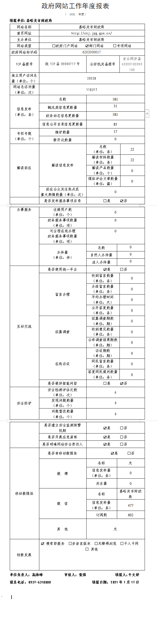 嘉峪关市财政局2021年政府网站工作年度报表