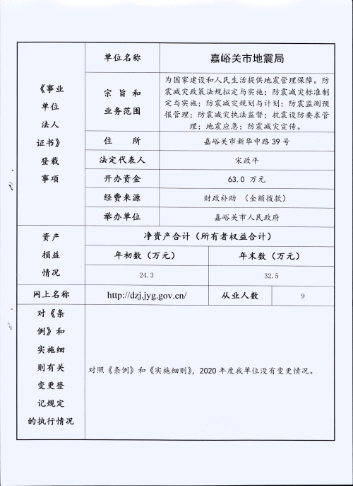 嘉峪关市地震局2020年度事业单位法人年度报告书