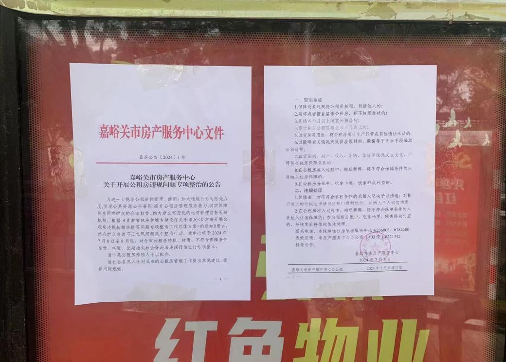 发布整治公告。7月初,围绕《甘肃省住建厅关于印发<甘肃省开展公租房违规转租转借等问题专项整治工作总体方案>的通知》中9个方面的重点整治内容,先后2次通过中心门户网站、小区公示栏等张贴发布了《嘉峪关市房产服务中心关于开展公租房违规问题专项整治的公告》。同时,对于首次核查中未入户的承租户,上门张贴《公租房违规问题专项核查通知》,要求租户限期配合进行居住信息核对。