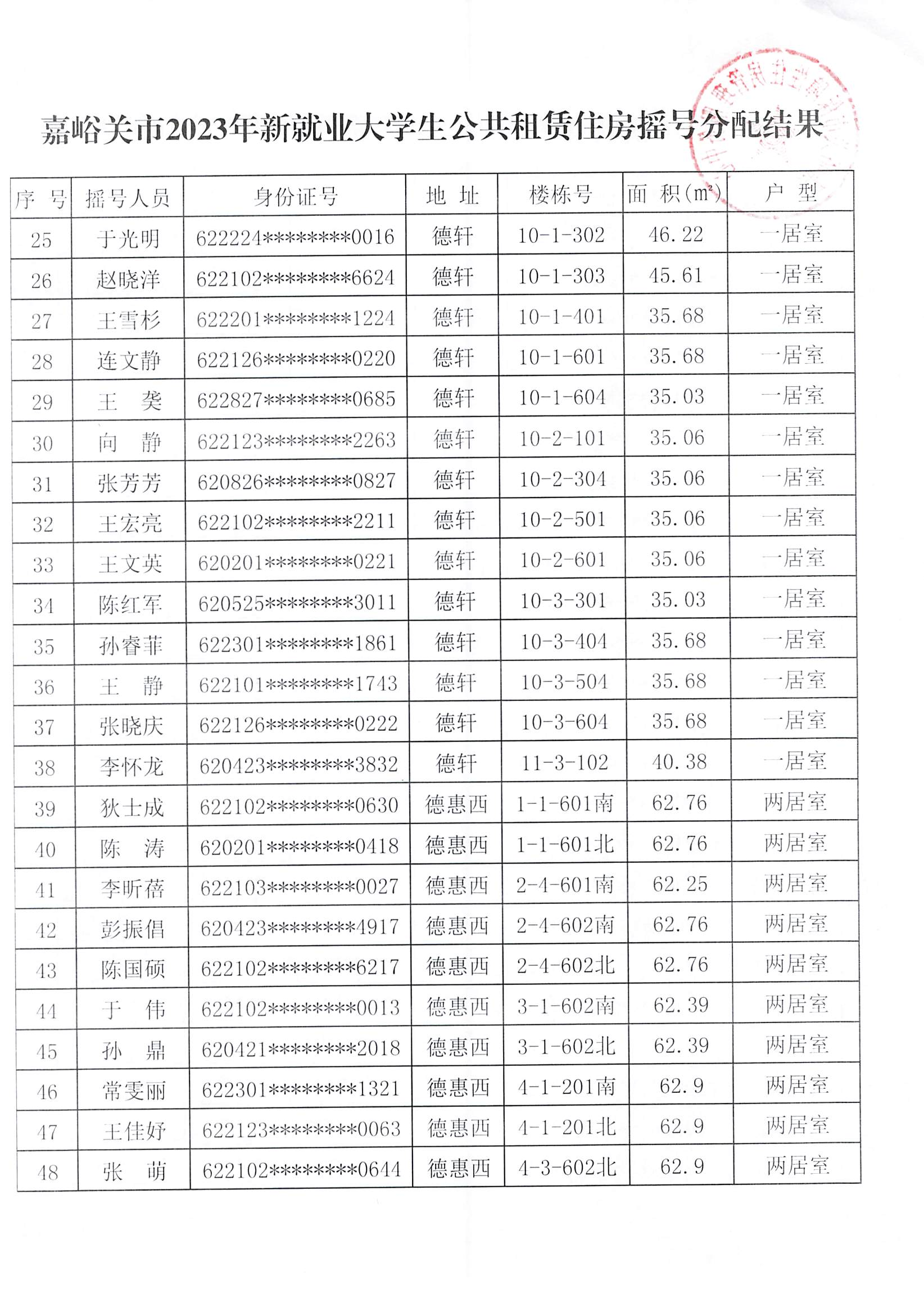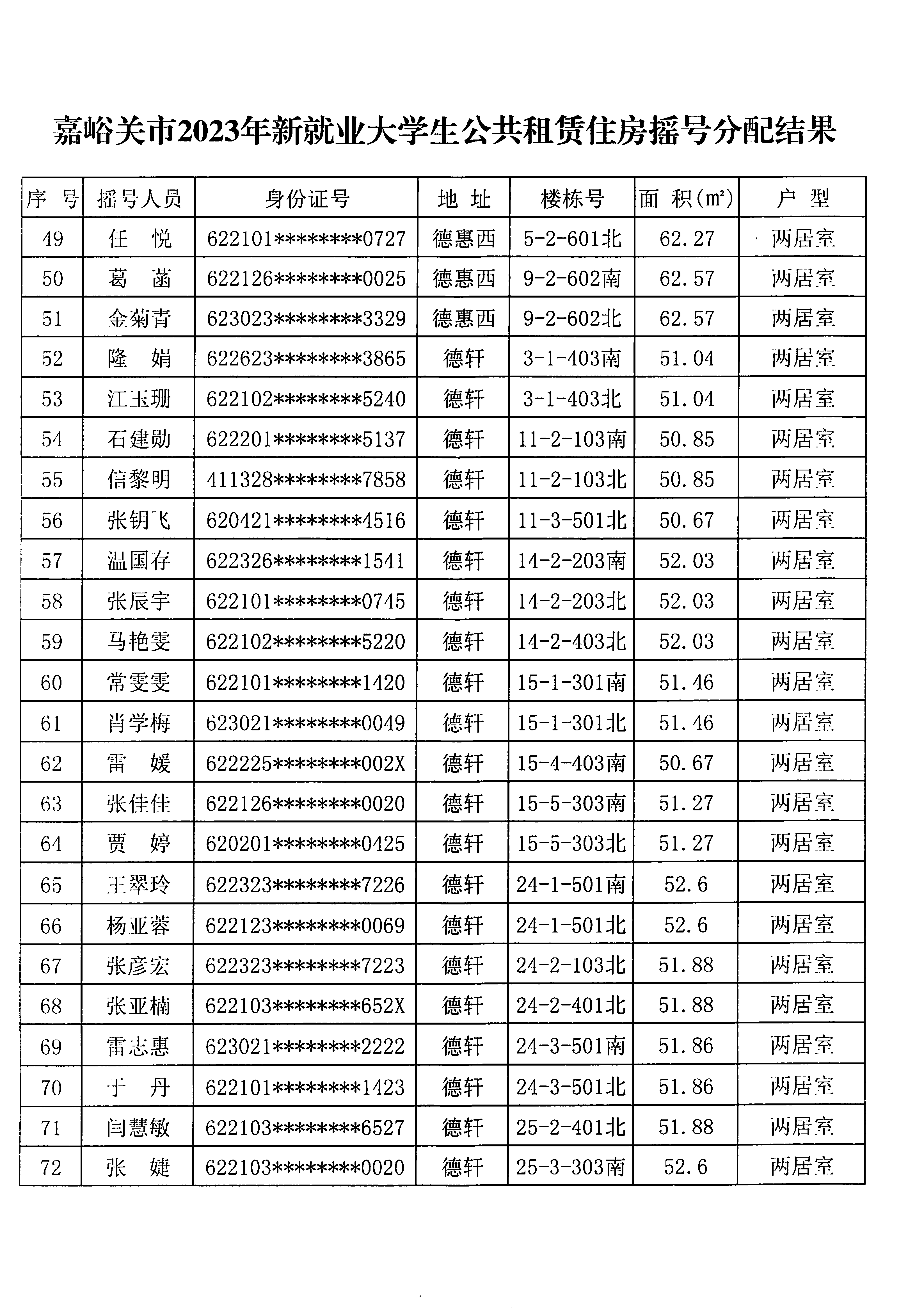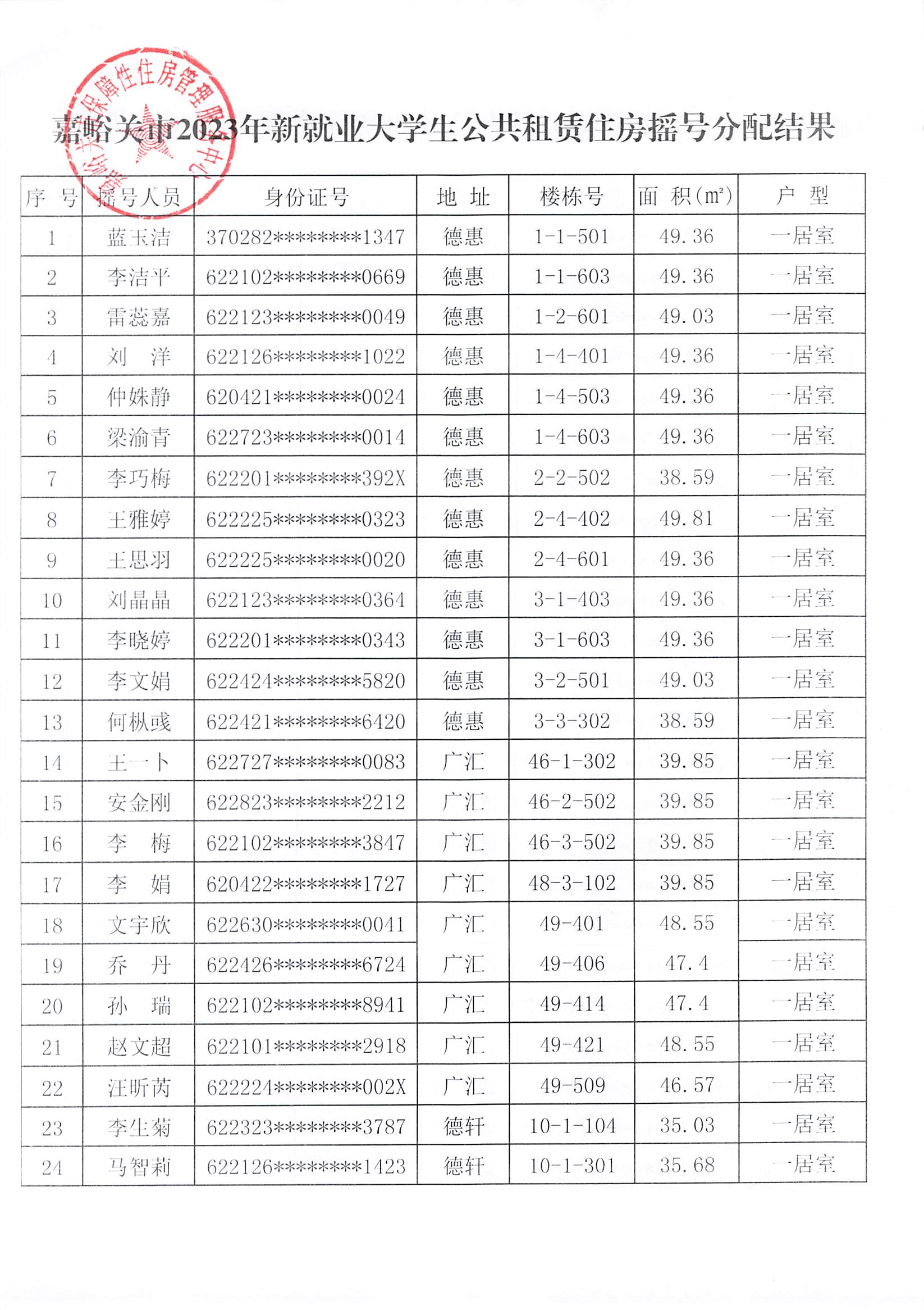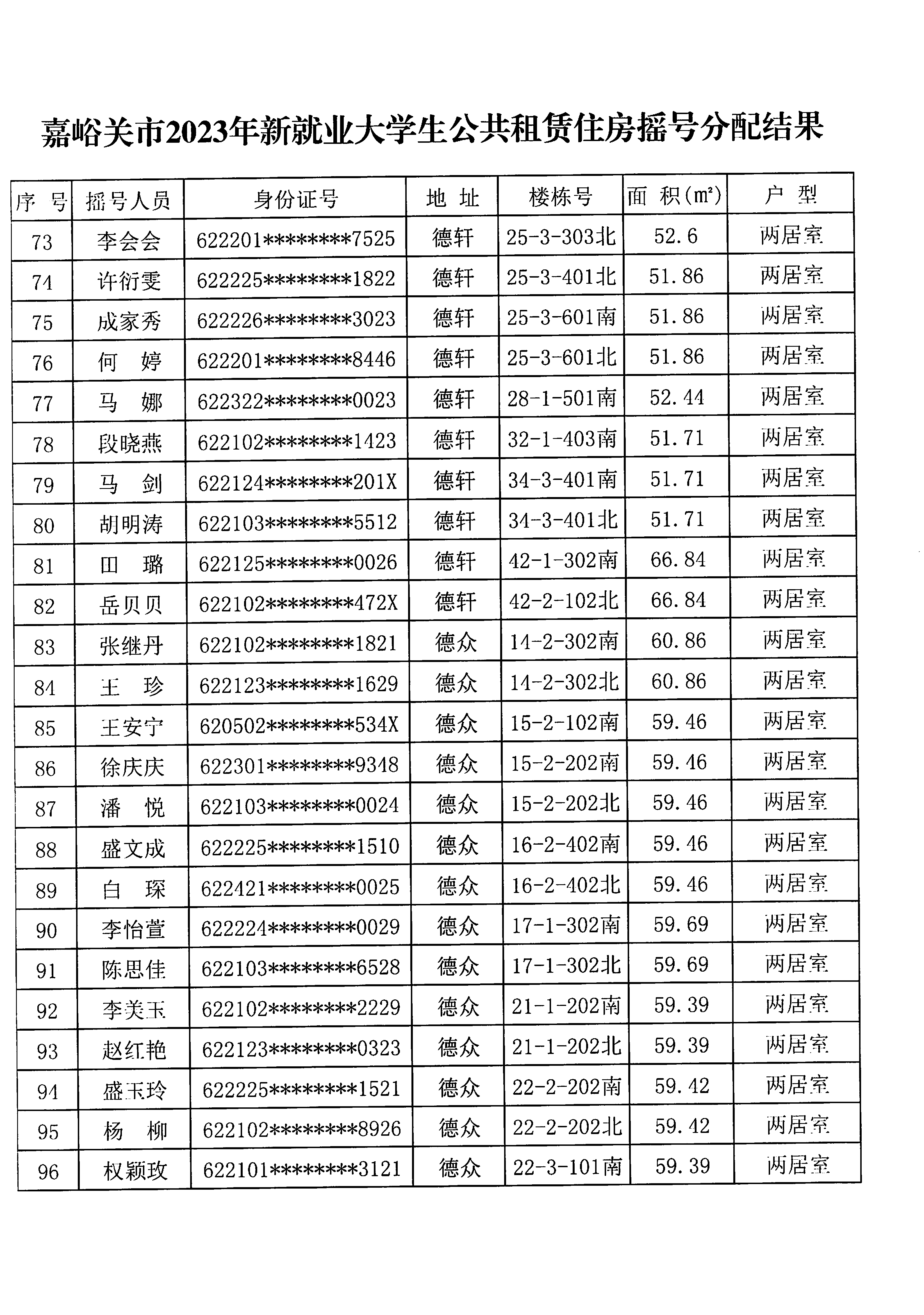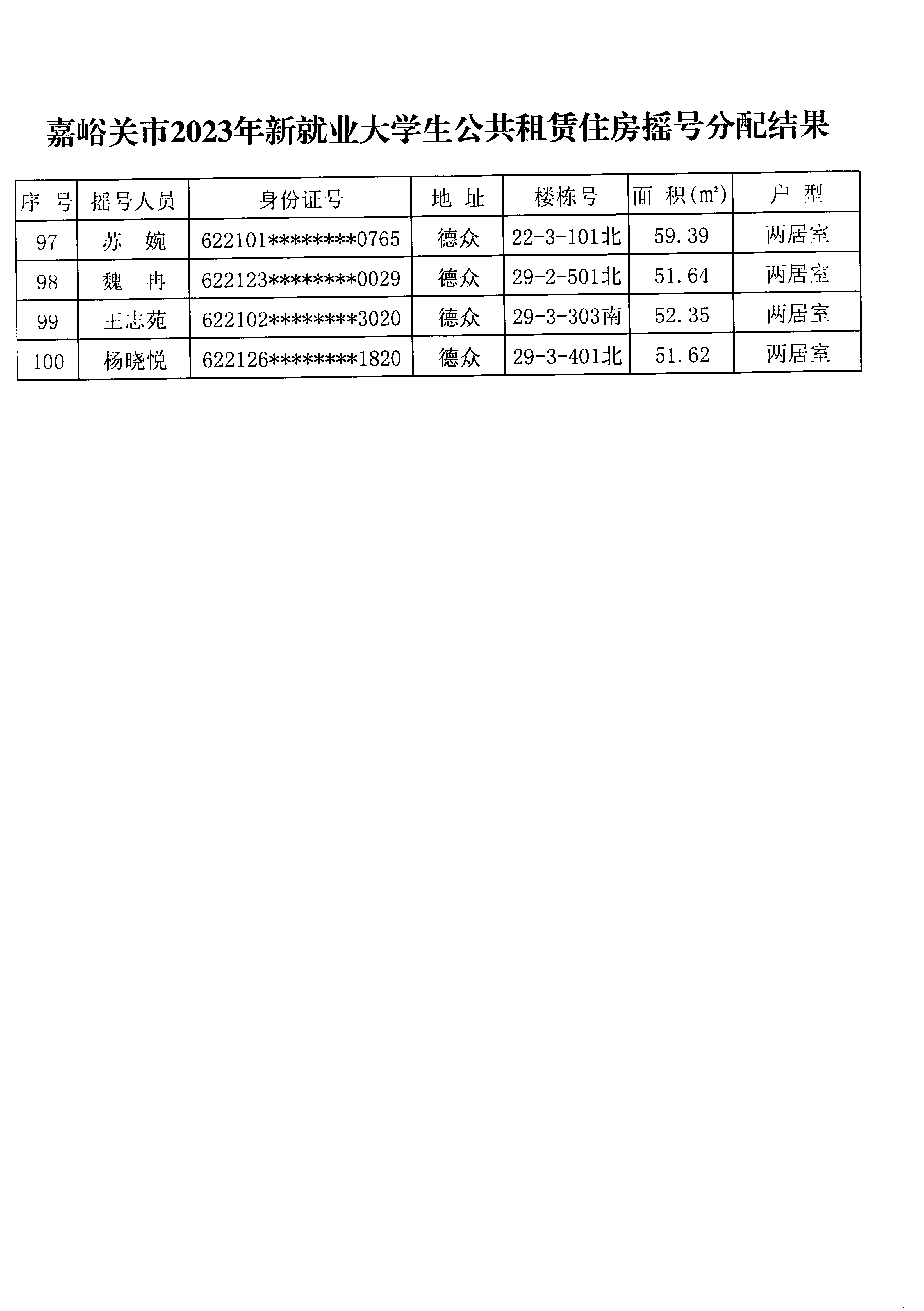 嘉峪关市2023年新就业大学生公共租赁住房摇号分配结果