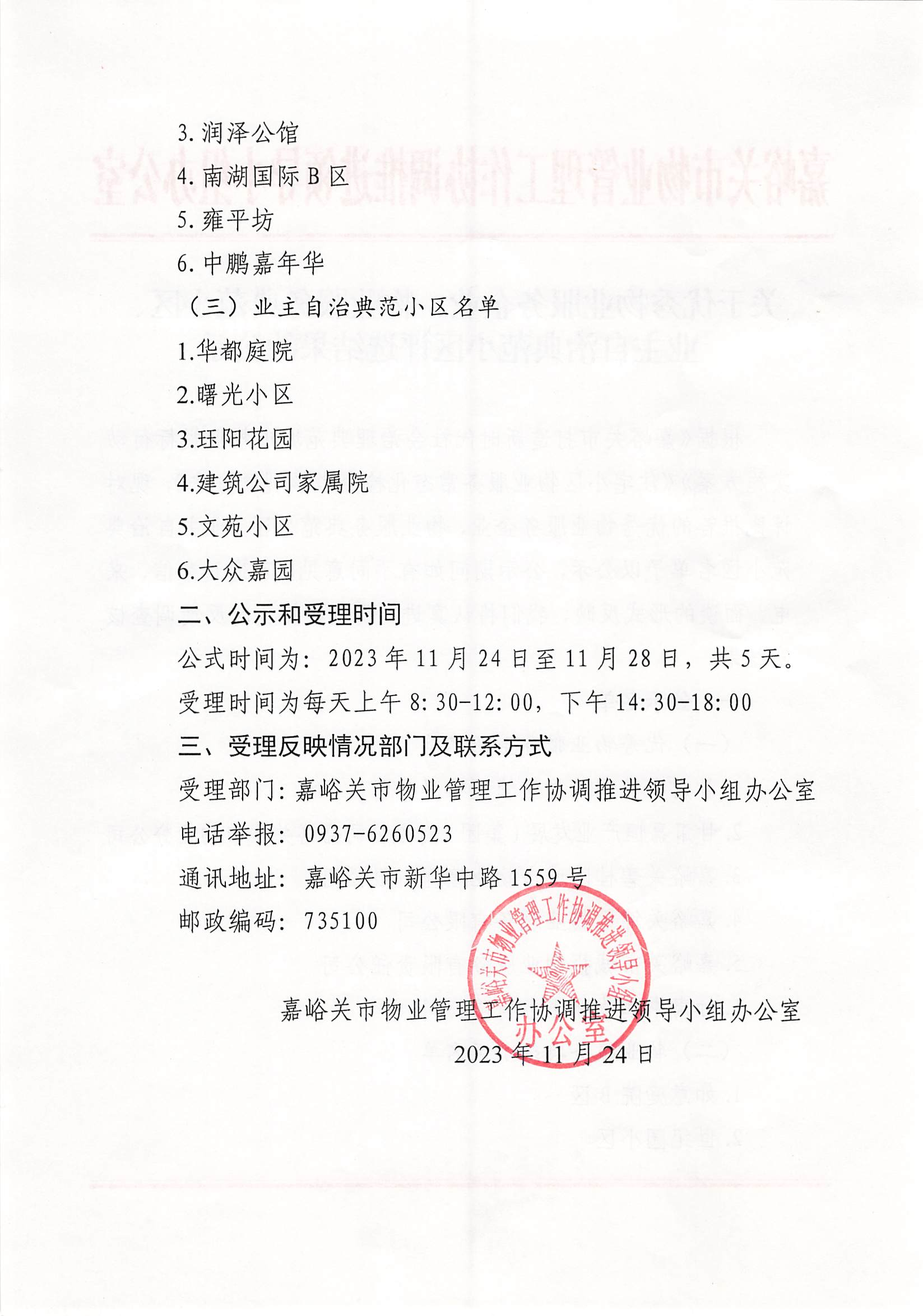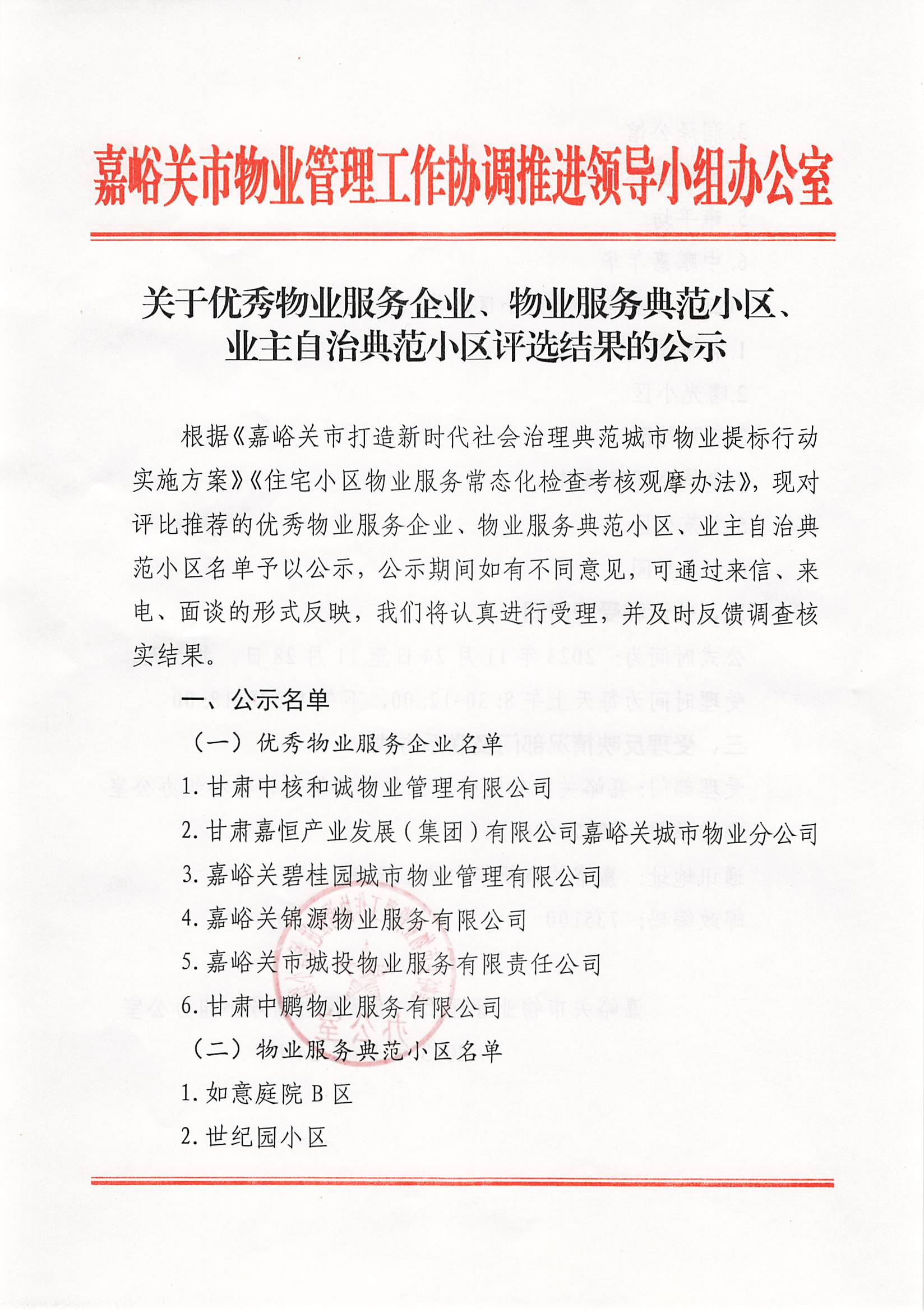 关于优秀物业服务企业、物业服务典范小区、业主自治典范小区评选结果的公示