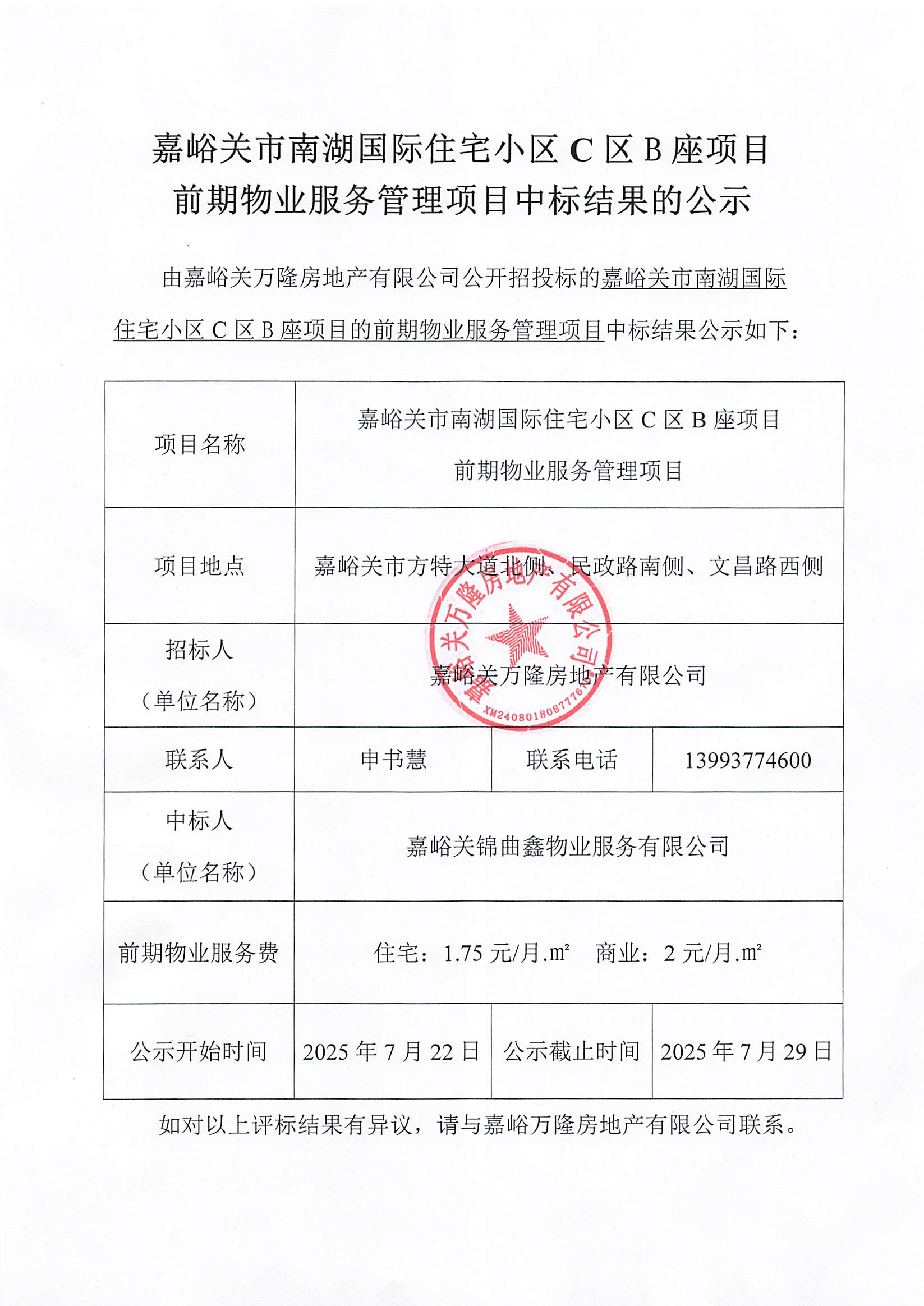 嘉峪关市南湖国际住宅小区C区B座项目前期物业服务管理项目中标结果的公示
