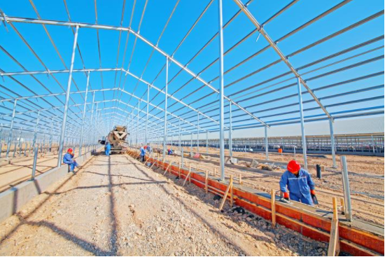秋日的雄关,夕阳余晖给一座座现代化标准牛舍涂上一抹金黄。12座现代化标准牛舍在占地1100亩的戈壁滩上整齐排列,气势不凡,施工人员在起重机械的协助下,正在对新建牛舍顶棚进行安装。
