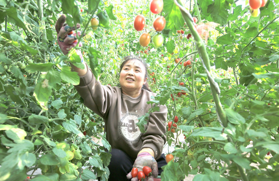 新城镇新城村戈壁农业产业园日光温室里的水果珍珠西红柿成熟上市,种植户采摘供应市场。 近年来,新城村因地制宜,大力发展戈壁设施农业,引进新品种、新技术,采取“研发+种植+销售”于一体的种植新模式,积极鼓励农民种植反季节蔬菜水果,既丰富了市民“菜篮子”“果盘子”,又鼓起了农民“钱袋子”。葫芦河 摄