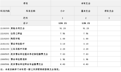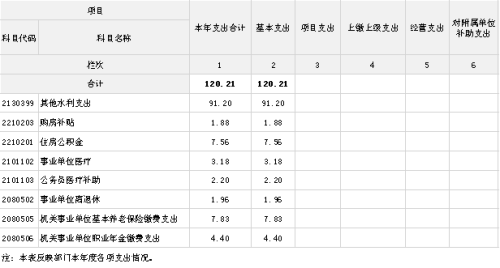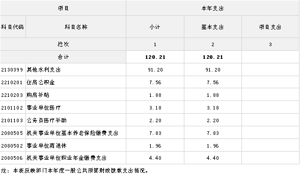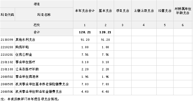 2023年度支出合计120.21万元,均为基本支出,占100%。其中:其他水利支出91.2万元、购房补贴支出1.88万元、住房公积金支出7.56万元、事业单位医疗支出3.18万元、公务员医疗补助支出2.20万元、机关事业单位基本养老保险缴费支出7.83万元、机关事业单位职业年金缴费支出4.40万元。