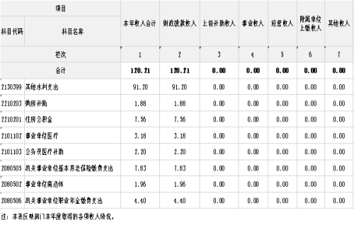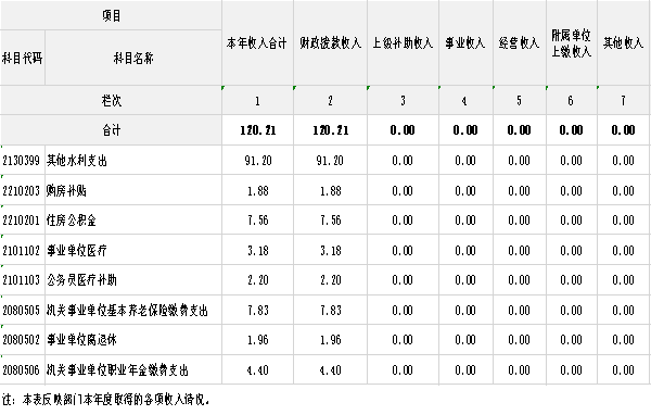 2023年度收入合计120.21万元,均为财政拨款收入,占100%。其中:其他水利91.2万元、购房补贴1.88万元、住房公积金7.56万元、事业单位医疗3.18万元、公务员医疗补助2.20万元、机关事业单位基本养老保险缴费7.83万元、机关事业单位职业年金缴费4.40万元。