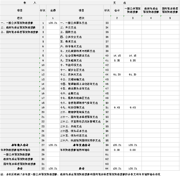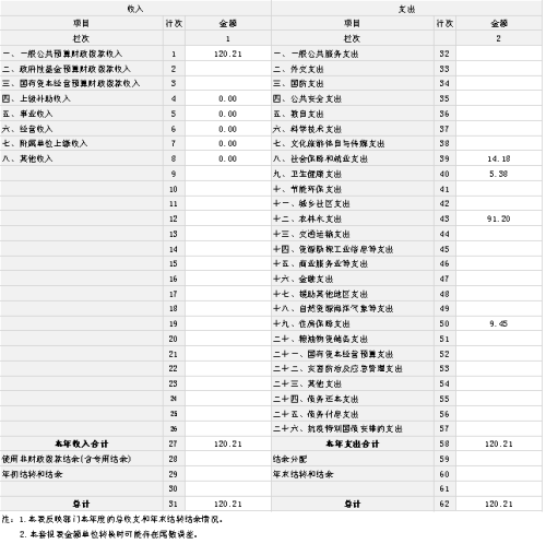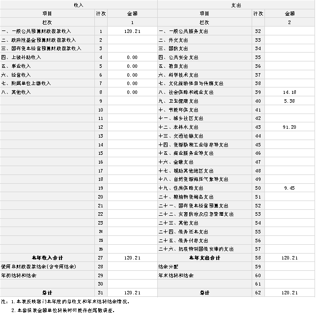 2023年度财政拨款收、支总计均为120.21万元。与上年度相比收、支总计均增加10.21万元,均增长9.28%,主要原因是调入人员导致经费增加。具体收支情况为:一般公共预算财政拨款收入120.21万元;社会保障和就业支出14.18万元、卫生健康支出5.38万元、农林水支出91.20万元、住房保障支出9.45万元。