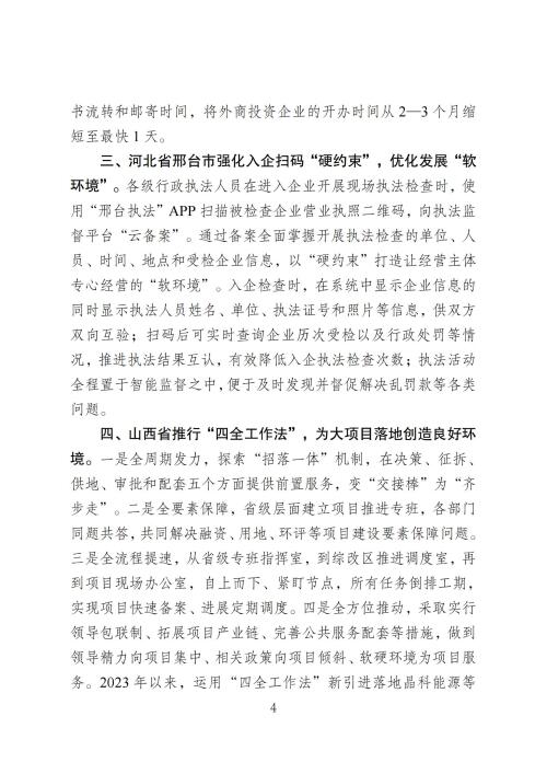 为认真贯彻习近平总书记关于持续建设市场化、法治化、国际化一流营商环境的重要指示批示精神,推动党中央、国务院关于做好优化营商环境工作的部署落地落实,经国务院领导同志批准,国务院办公厅于2024年4月8日—19日组织对北京、河北、山西、辽宁、吉林、上海、江苏、浙江、安徽、福建、山东、河南、湖北、广东、海南、重庆、四川、陕西、青海、新疆等 20个省(区、市)开展了优化营商环境专项督查。总体上看,各地紧紧围绕党中央重大决策部署,将优化营商环境工作摆在重要位置,加快推进重点领域和关键环节改革,在建设全国统一大市场、促进民营经济健康发展、推进高水平对外开放、优化政务服务提升行政效能等方面,创新实施了一大批好举措好做法,取得积极成效。李强总理4月26日主持召开国务院常务会议,听取了优化营商环境专项督查情况汇报。按照会议部署要求,现将各地的一些经验做法予以通报,供各地学习借鉴。各地区、各有关部门要全面贯彻落实党中央、国务院决策部署,结合实际探索创新、深化改革,持续打造市场化、法治化、国际化一流营商环境,进一步激发市场活力、提振发展信心、改善社会预期,巩固和增强经济回升向好态势,推动高质量发展不断取得新的成效。