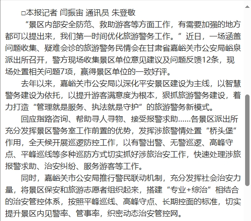 “景区内部安全防范、救助游客等方面工作,有需要加强的地方都可以提出来,我们第一时间优化旅游警务工作。”近日,一场涵盖问题收集、疑难会诊的旅游警务民情会在甘肃省嘉峪关市公安局峪泉派出所召开,警方现场收集景区单位意见建议及问题反馈12条,现场处置相关问题7项,赢得景区单位的一致好评。