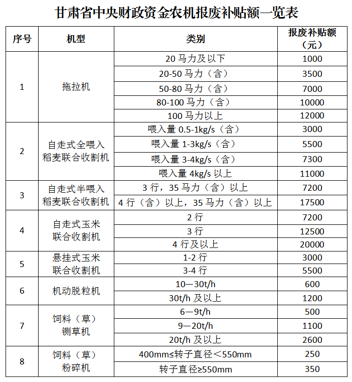补贴种类:依据《农业机械安全监督管理条例》规定,选择确定报废农机补贴种类为拖拉机、联合收割机、机动脱粒机、饲料(草)粉碎机、铡草机等农业机械。