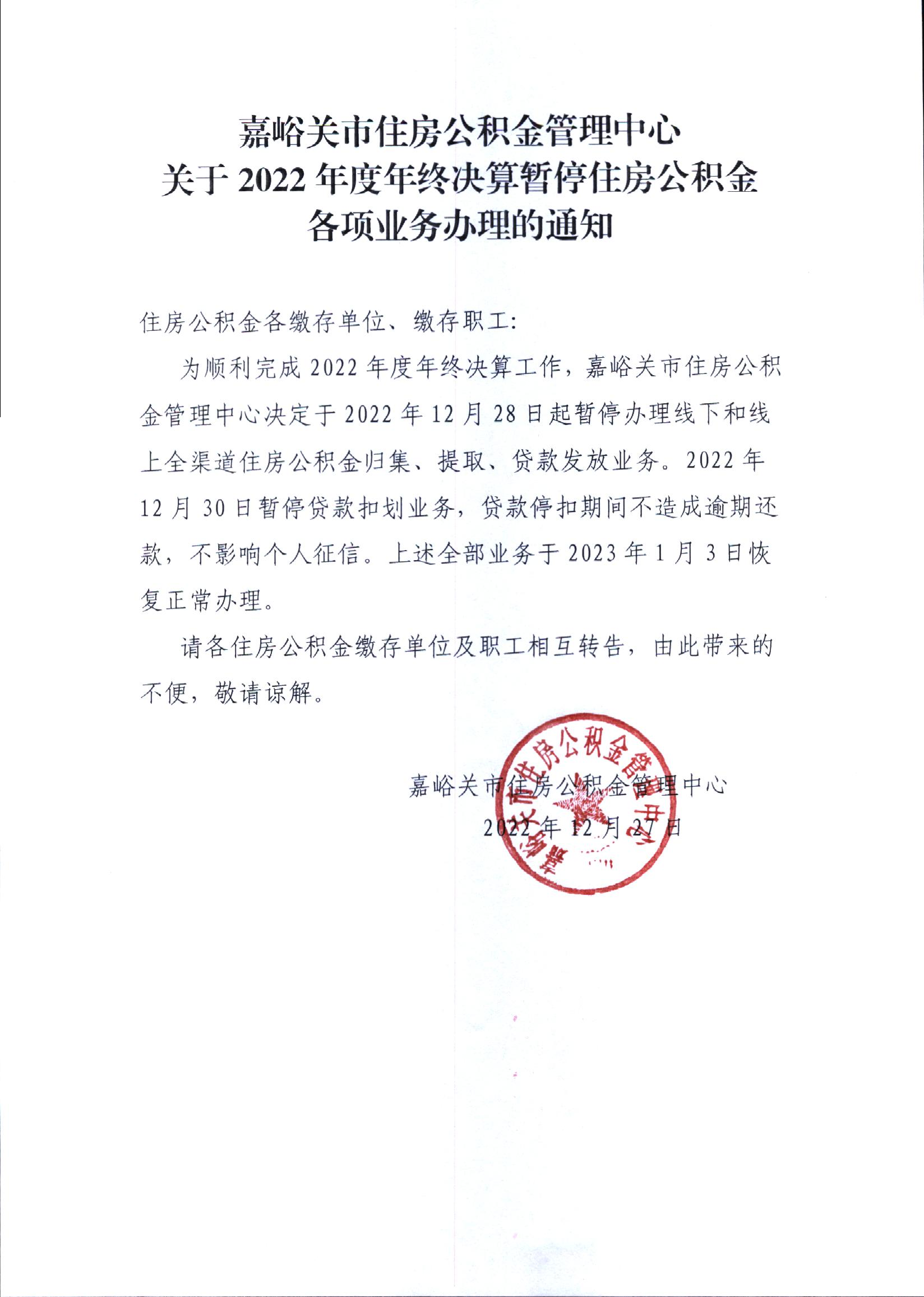 嘉峪关市住房公积金管理中心关于2022年度年终决算暂停住房公积金各项业务办理的通知